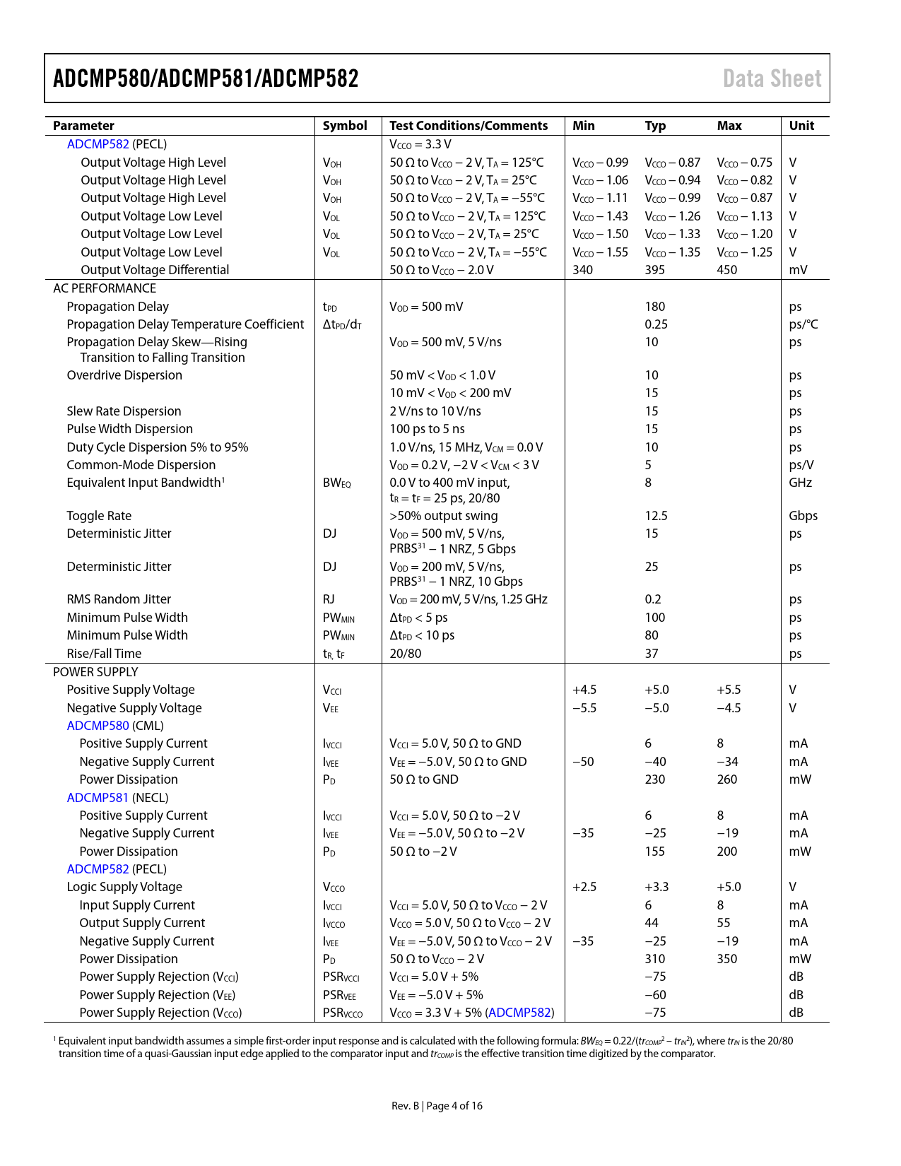 ADCMP580/ADCMP581/ADCMP582. Data Sheet. Parameter. Symbol. Test Conditions/Comments. Min. Typ. Max. Unit