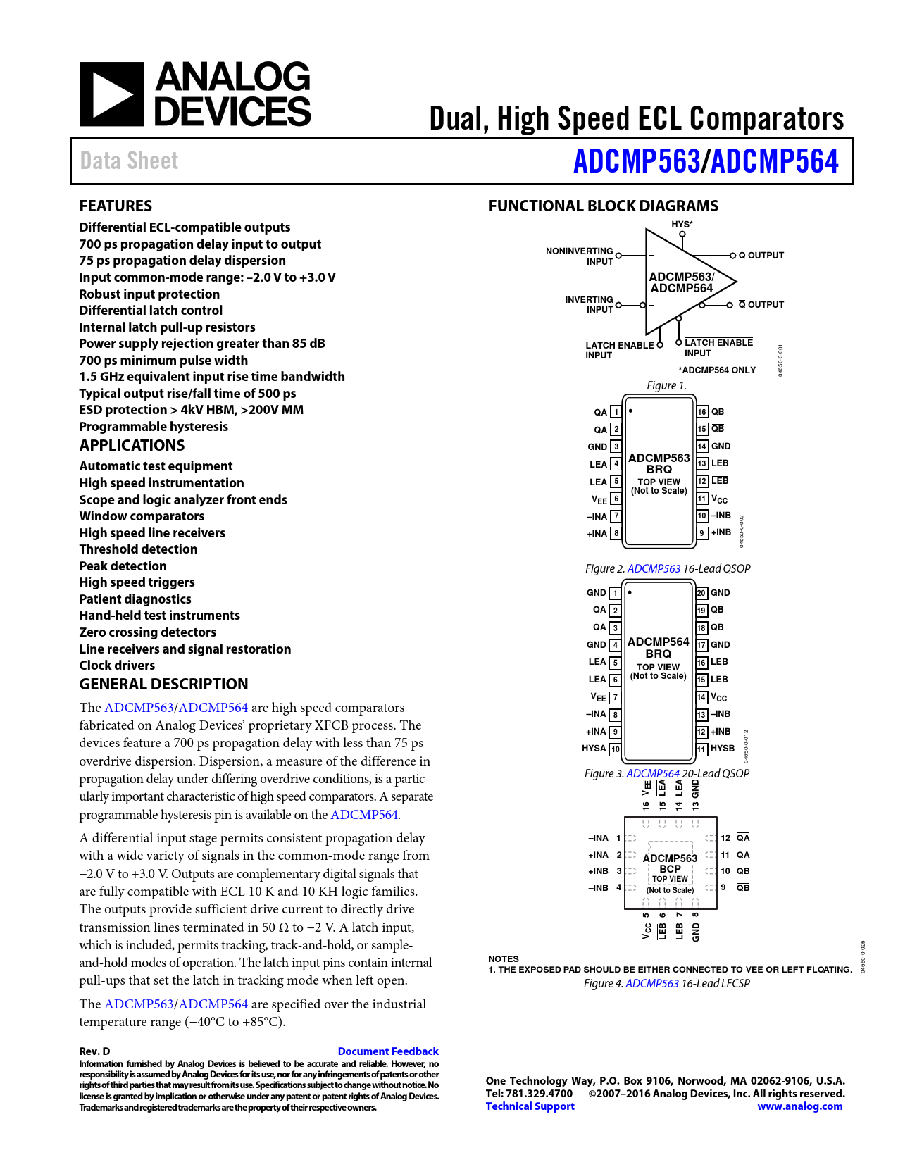 04650- pull-ups that set the latch in tracking mode when left open. Figure 4. ADCMP563 16-Lead LFCSP The ADCMP563/ADCMP564 are specified over the industrial temperature range (−40°C to +85°C).