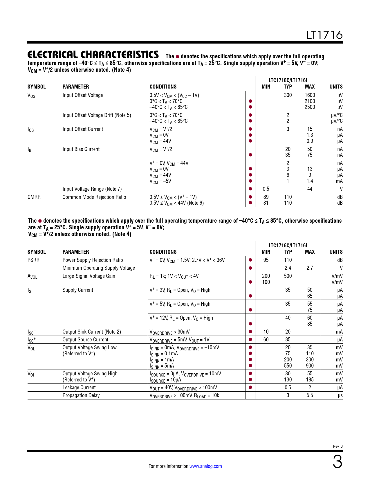 LT1716 ELECTRICAL CHARACTERISTICSThe l denotes the specifications which apply over the full operatingtemperature range of –40°C ≤ TA ≤ 85°C, otherwise specifications are at TA = 25°C. Single supply operation V+ = 5V, V– = 0V;VCM = V+/2 unless otherwise noted. (Note 4)LTC1716C/LT1716ISYMBOLPARAMETERCONDITIONSMINTYPMAXUNITS VOS Input Offset Voltage 0.5V < VCM < (VCC – 1V) 300 1600 µV 0°C < TA < 70°C l 2100 µV –40°C < TA < 85°C l 2500 µV Input Offset Voltage Drift (Note 5) 0°C < TA < 70°C l 2 µV/°C –40°C < TA < 85°C l 2 µV/°C IOS Input Offset Current VCM = V+/2 l 3 15 nA VCM = 0V l 1.3 µA VCM = 44V l 0.9 µA IB Input Bias Current VCM = V+/2 20 50 nA l 35 75 nA V+ = 0V, VCM = 44V 2 nA VCM = 0V l 3 13 µA VCM = 44V l 6 9 µA VCM = –5V l 1 1.4 mA Input Voltage Range (Note 7) l 0.5 44 V CMRR Common Mode Rejection Ratio 0.5V ≤ VCM < (V+ – 1V) l 89 110 dB 0.5V ≤ VCM < 44V (Note 6) l 81 110 dB The l denotes the specifications which apply over the full operating temperature range of –40°C ≤ TA ≤ 85°C, otherwise specificationsare at TA = 25°C. Single supply operation V+ = 5V, V– = 0V;VCM = V+/2 unless otherwise noted. (Note 4)LTC1716C/LT1716ISYMBOLPARAMETERCONDITIONSMINTYPMAXUNITS PSRR Power Supply Rejection Ratio V– = 0V, VCM = 1.5V; 2.7V < V+ < 36V l 95 110 dB Minimum Operating Supply Voltage l 2.4 2.7 V AVOL Large-Signal Voltage Gain RL = 1k; 1V < VOUT < 4V 200 500 V/mV l 100 V/mV IS Supply Current V+ = 3V, RL = Open, VO = High 35 50 µA l 65 µA V+ = 5V, RL = Open, VO = High 35 55 µA l 75 µA V+ = 12V, RL = Open, VO = High 40 60 µA l 85 µA I – SC Output Sink Current (Note 2) VOVERDRIVE > 30mV l 10 20 mA I + SC Output Source Current VOVERDRIVE = 5mV, VOUT = 1V l 60 85 µA VOL Output Voltage Swing Low ISINK = 0mA, VOVERDRIVE = –10mV l 20 35 mV (Referred to V–) ISINK = 0.1mA l 75 110 mV ISINK = 1mA l 200 300 mV ISINK = 5mA l 550 900 mV VOH Output Voltage Swing High ISOURCE = 0µA, VOVERDRIVE = 10mV l 30 55 mV (Referred to V+) ISOURCE = 10µA l 130 185 mV Leakage Current VOUT = 40V, VOVERDRIVE > 100mV l 0.5 2 µA Propagation Delay VOVERDRIVE > 100mV, RLOAD = 10k 3 5.5 µs Rev. B For more information www.analog.com 3 Document Outline Features Applications Typical Application Description Absolute Maximum Ratings Order Information Pin Configuration Electrical Characteristics Typical Performance Characteristics Applications Information Simplified Schematic Package Description Revision History Typical ApplicationS Related Parts