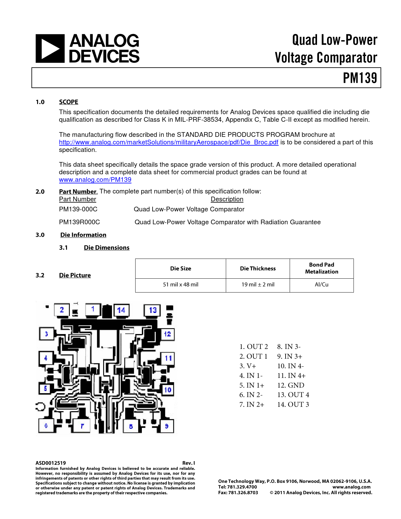 This specification documents the detailed requirements for Analog Devices space qualified die including die qualification as described for Class K in MIL-PRF-38534, Appendix C, Table C-II except as modified herein. The manufacturing flow described in the STANDARD DIE PRODUCTS PROGRAM brochure at http://www.analog.com/marketSolutions/militaryAerospace/pdf/Die_Broc.pdf is to be considered a part of this specification. This data sheet specifically details the space grade version of this product. A more detailed operational description and a complete data sheet for commercial product grades can be found at www.analog.com/PM139 The complete part number(s) of this specification follow: Part Number Description PM139-000C Quad Low-Power Voltage Comparator PM139R000C Quad Low-Power Voltage Comparator with Radiation Guarantee