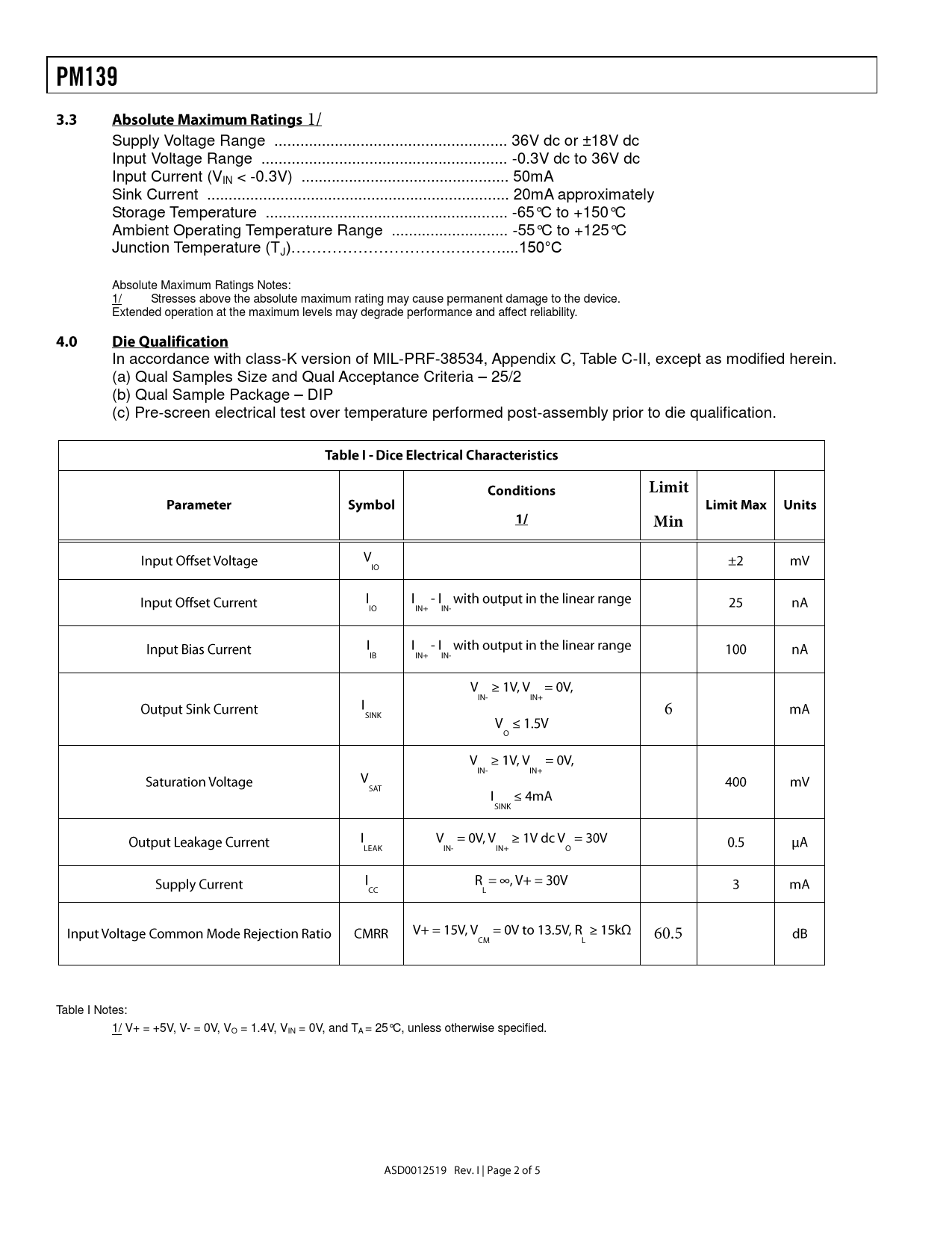Supply Voltage Range .. 36V dc or ±18V dc Input Voltage Range ... -0.3V dc to 36V dc Input Current (VIN < -0.3V) .. 50mA Sink Current .. 20mA approximately Storage Temperature .. -65°C to +150°C Ambient Operating Temperature Range ... -55°C to +125°C Junction Temperature (T )………………………….… J .……..150°C Absolute Maximum Ratings Notes: 1/ Stresses above the absolute maximum rating may cause permanent damage to the device. Extended operation at the maximum levels may degrade performance and affect reliability. In accordance with class-K version of MIL-PRF-38534, Appendix C, Table C-II, except as modified herein. (a) Qual Samples Size and Qual Acceptance Criteria – 25/2 (b) Qual Sample Package – DIP (c) Pre-screen electrical test over temperature performed post-assembly prior to die qualification. Table I Notes: 1/ V+ = +5V, V- = 0V, VO = 1.4V, VIN = 0V, and TA = 25°C, unless otherwise specified.