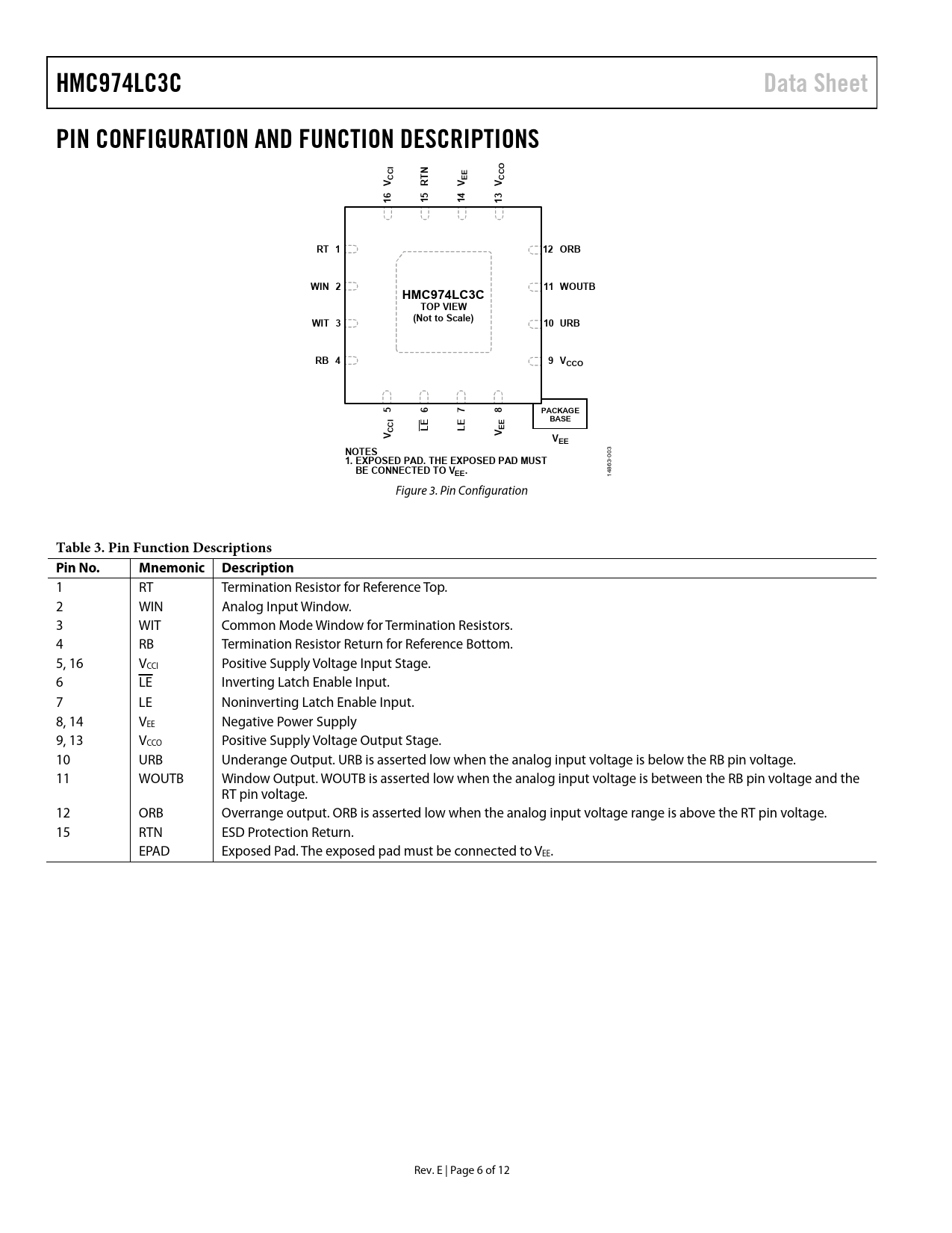HMC974LC3CData SheetPIN CONFIGURATION AND FUNCTION DESCRIPTIONSINOCCEECCVRTVV16151413RT 112 ORBWIN 211 WOUTBHMC974LC3CTOP VIEW(Not to Scale)WIT 310 URBRB 49 VCCO5678PACKAGEIBASECCLELEEEVVVEENOTES -003 1. EXPOSED PAD. THE EXPOSED PAD MUST 863 BE CONNECTED TO VEE. 14 Figure 3. Pin Configuration Table 3. Pin Function Descriptions Pin No.MnemonicDescription 1 RT Termination Resistor for Reference Top. 2 WIN Analog Input Window. 3 WIT Common Mode Window for Termination Resistors. 4 RB Termination Resistor Return for Reference Bottom. 5, 16 VCCI Positive Supply Voltage Input Stage. 6 LE Inverting Latch Enable Input. 7 LE Noninverting Latch Enable Input. 8, 14 VEE Negative Power Supply 9, 13 VCCO Positive Supply Voltage Output Stage. 10 URB Underange Output. URB is asserted low when the analog input voltage is below the RB pin voltage. 11 WOUTB Window Output. WOUTB is asserted low when the analog input voltage is between the RB pin voltage and the RT pin voltage. 12 ORB Overrange output. ORB is asserted low when the analog input voltage range is above the RT pin voltage. 15 RTN ESD Protection Return. EPAD Exposed Pad. The exposed pad must be connected to VEE. Rev. E | Page 6 of 12 Document Outline FEATURES APPLICATIONS FUNCTIONAL BLOCK DIAGRAM GENERAL DESCRIPTION TABLE OF CONTENTS REVISION HISTORY SPECIFICATIONS TIMING DIAGRAM ABSOLUTE MAXIMUM RATINGS ESD CAUTION PIN CONFIGURATION AND FUNCTION DESCRIPTIONS INTERFACE SCHEMATICS TYPICAL PERFORMANCE CHARACTERISTICS THEORY OF OPERATION POWER SEQUENCING APPLICATIONS INFORMATION EVALUATION BOARD OUTLINE DIMENSIONS ORDERING GUIDE