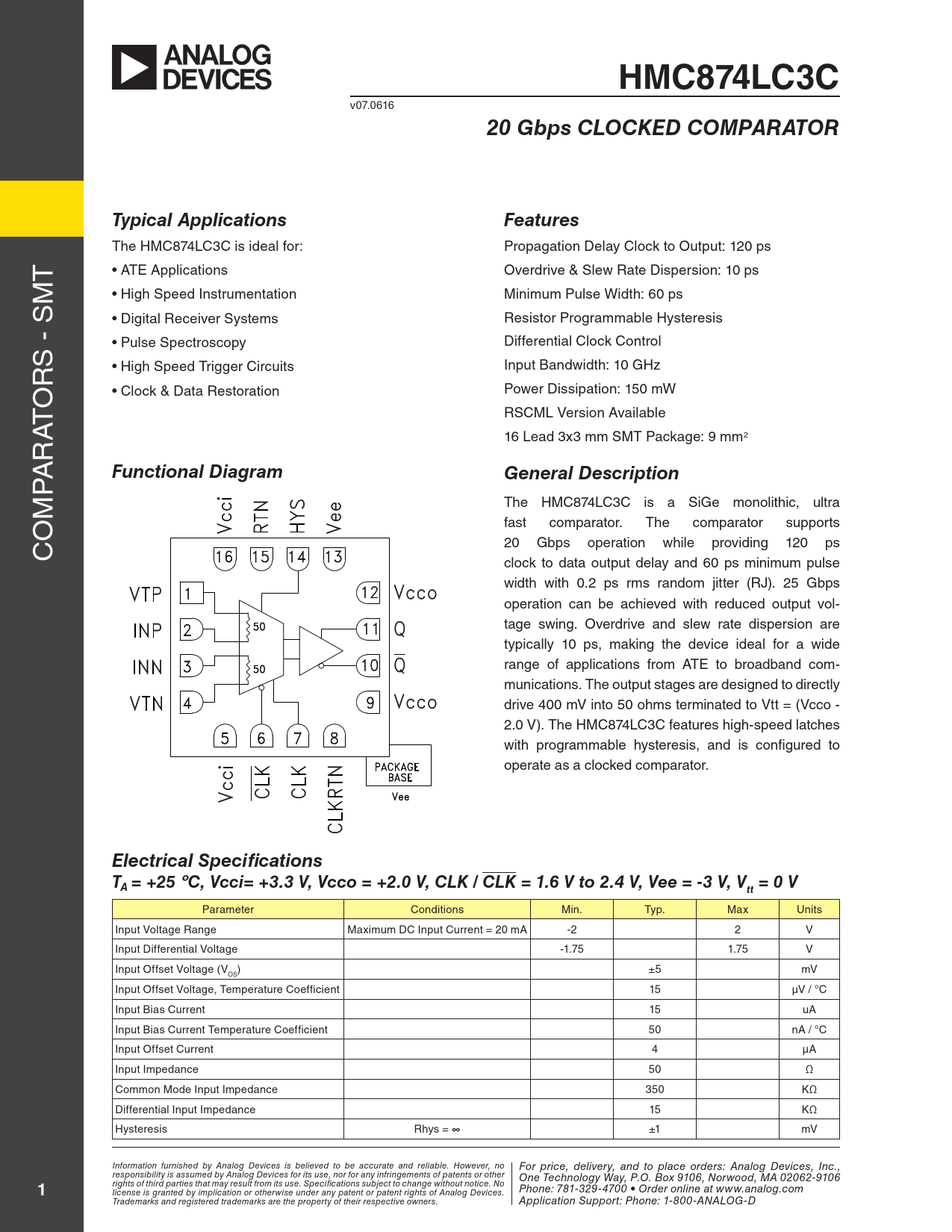 HMC874LC3C v07.0616 20 Gbps CLOCKED COMPARATORTypical ApplicationsFeatures The HMC874LC3C is ideal for: Propagation Delay Clock to Output: 120 ps T • ATE Applications Overdrive & Slew Rate Dispersion: 10 ps M • High Speed Instrumentation Minimum Pulse Width: 60 ps • Digital Receiver Systems Resistor Programmable Hysteresis S - S • Pulse Spectroscopy Differential Clock Control R • High Speed Trigger Circuits Input Bandwidth: 10 GHz O • Clock & Data Restoration Power Dissipation: 150 mW RSCML Version Available AT R 16 Lead 3x3 mm SMT Package: 9 mm2 A P Functional DiagramGeneral Description The HMC874LC3C is a SiGe monolithic, ultra OM fast comparator. The comparator supports C 20 Gbps operation while providing 120 ps clock to data output delay and 60 ps minimum pulse width with 0.2 ps rms random jitter (RJ). 25 Gbps operation can be achieved with reduced output vol- tage swing. Overdrive and slew rate dispersion are typical y 10 ps, making the device ideal for a wide range of applications from ATE to broadband com- munications. The output stages are designed to directly drive 400 mV into 50 ohms terminated to Vtt = (Vcco - 2.0 V). The HMC874LC3C features high-speed latches with programmable hysteresis, and is configured to operate as a clocked comparator. Electrical SpecificationsTA = +25 ºC, Vcci= +3.3 V, Vcco = +2.0 V, CLK / CLK = 1.6 V to 2.4 V, Vee = -3 V, V = 0 Vtt Parameter Conditions Min. Typ. Max Units Input Voltage Range Maximum DC Input Current = 20 mA -2 2 V Input Differential Voltage -1.75 1.75 V Input Offset Voltage (V ) ±5 mV OS Input Offset Voltage, Temperature Coefficient 15 µV / °C Input Bias Current 15 uA Input Bias Current Temperature Coefficient 50 nA / °C Input Offset Current 4 µA Input Impedance 50 Ω Common Mode Input Impedance 350 KΩ Differential Input Impedance 15 KΩ Hysteresis Rhys = ∞ ±1 mV Information furnished by Analog Devices is believed to be accurate and reliable. However, no For price, delivery, and to place orders: Analog Devices, Inc., responsibility is assumed by Analog Devices for its use, nor for any infringements of patents or other One Technology Way, P.O. Box 9106, Norwood, MA 02062-9106 1 rights of third parties that may result from its use. Specifications subject to change without notice. No Phone: 781-329-4700 • Order online at www.analog.com license is granted by implication or otherwise under any patent or patent rights of Analog Devices. Trademarks and registered trademarks are the property of their respective owners. Application Support: Phone: 1-800-ANALOG-D Document Outline Typical Applications Features Functional Diagram General Description Electrical Specifications Performance Characteristics Outline Drawing Package Information Evaluation PCB CLK, CLK Interfacing Resistor Network Bias Tee