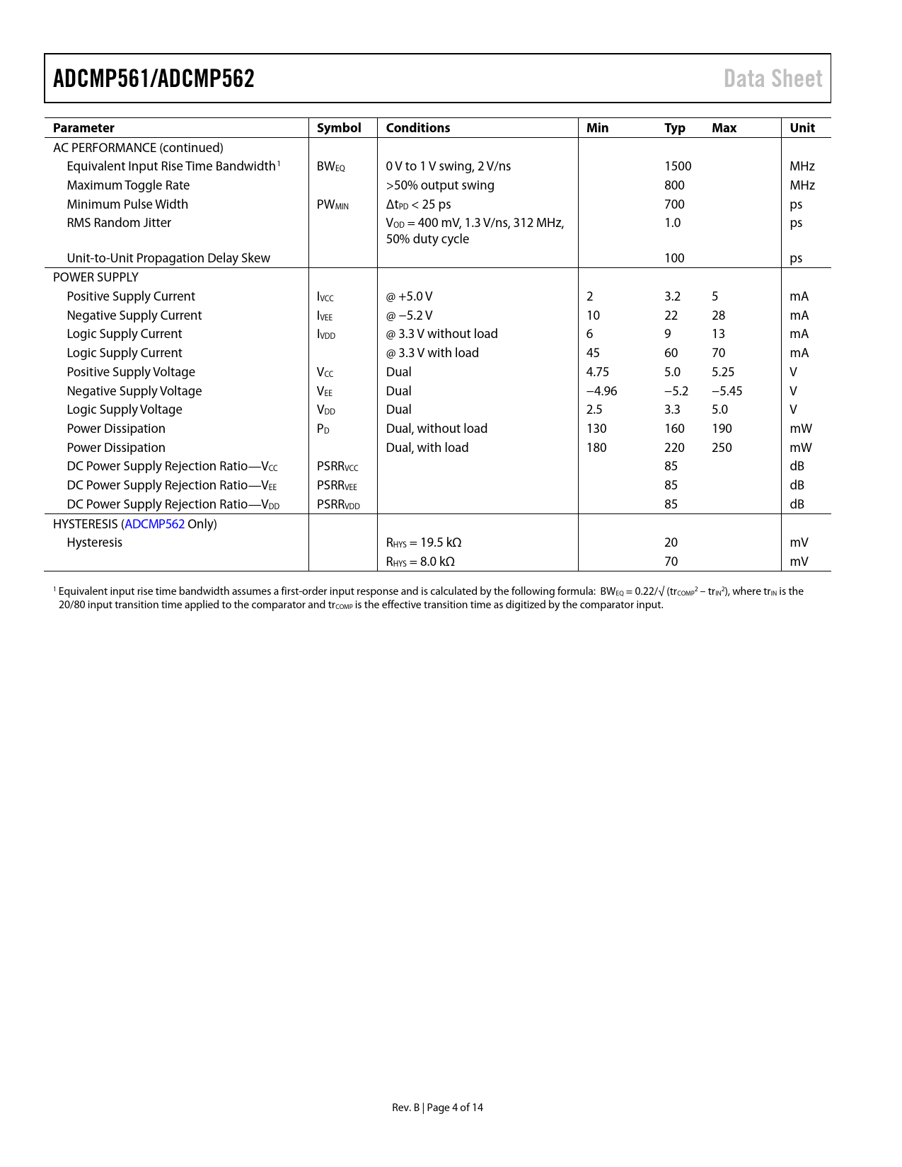 link to page 4 ADCMP561/ADCMP562Data SheetParameterSymbolConditionsMinTypMaxUnit AC PERFORMANCE (continued) Equivalent Input Rise Time Bandwidth1 BWEQ 0 V to 1 V swing, 2 V/ns 1500 MHz Maximum Toggle Rate >50% output swing 800 MHz Minimum Pulse Width PWMIN ΔtPD < 25 ps 700 ps RMS Random Jitter VOD = 400 mV, 1.3 V/ns, 312 MHz, 1.0 ps 50% duty cycle Unit-to-Unit Propagation Delay Skew 100 ps POWER SUPPLY Positive Supply Current IVCC @ +5.0 V 2 3.2 5 mA Negative Supply Current IVEE @ −5.2 V 10 22 28 mA Logic Supply Current IVDD @ 3.3 V without load 6 9 13 mA Logic Supply Current @ 3.3 V with load 45 60 70 mA Positive Supply Voltage VCC Dual 4.75 5.0 5.25 V Negative Supply Voltage VEE Dual −4.96 −5.2 −5.45 V Logic Supply Voltage VDD Dual 2.5 3.3 5.0 V Power Dissipation PD Dual, without load 130 160 190 mW Power Dissipation Dual, with load 180 220 250 mW DC Power Supply Rejection Ratio—VCC PSRRVCC 85 dB DC Power Supply Rejection Ratio—VEE PSRRVEE 85 dB DC Power Supply Rejection Ratio—VDD PSRRVDD 85 dB HYSTERESIS (ADCMP562 Only) Hysteresis RHYS = 19.5 kΩ 20 mV RHYS = 8.0 kΩ 70 mV 1 Equivalent input rise time bandwidth assumes a first-order input response and is calculated by the fol owing formula: BW 2 2 EQ = 0.22/√ (trCOMP – trIN ), where trIN is the 20/80 input transition time applied to the comparator and trCOMP is the effective transition time as digitized by the comparator input. Rev. B | Page 4 of 14 Document Outline FEATURES APPLICATIONS FUNCTIONAL BLOCK DIAGRAM GENERAL DESCRIPTION REVISION HISTORY SPECIFICATIONS ABSOLUTE MAXIMUM RATINGS THERMAL CONSIDERATIONS ESD CAUTION PIN CONFIGURATIONS AND FUNCTION DESCRIPTIONS TYPICAL PERFORMANCE CHARACTERISTICS TIMING INFORMATION APPLICATIONS INFORMATION CLOCK TIMING RECOVERY OPTIMIZING HIGH SPEED PERFORMANCE COMPARATOR PROPAGATION DELAY DISPERSION COMPARATOR HYSTERESIS MINIMUM INPUT SLEW RATE REQUIREMENT TYPICAL APPLICATION CIRCUITS OUTLINE DIMENSIONS ORDERING GUIDE