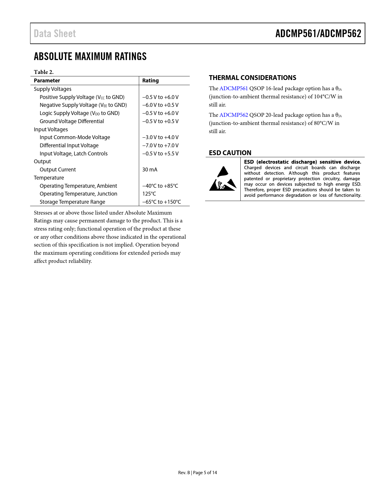 Data SheetADCMP561/ADCMP562ABSOLUTE MAXIMUM RATINGSTable 2. ParameterRatingTHERMAL CONSIDERATIONS Supply Voltages The ADCMP561 QSOP 16-lead package option has a θJA Positive Supply Voltage (VCC to GND) −0.5 V to +6.0 V (junction-to-ambient thermal resistance) of 104°C/W in Negative Supply Voltage (VEE to GND) −6.0 V to +0.5 V still air. Logic Supply Voltage (VDD to GND) −0.5 V to +6.0 V The ADCMP562 QSOP 20-lead package option has a θJA Ground Voltage Differential −0.5 V to +0.5 V (junction-to-ambient thermal resistance) of 80°C/W in Input Voltages still air. Input Common-Mode Voltage −3.0 V to +4.0 V Differential Input Voltage −7.0 V to +7.0 V Input Voltage, Latch Controls −0.5 V to +5.5 V ESD CAUTION Output Output Current 30 mA Temperature Operating Temperature, Ambient −40°C to +85°C Operating Temperature, Junction 125°C Storage Temperature Range −65°C to +150°C Stresses at or above those listed under Absolute Maximum Ratings may cause permanent damage to the product. This is a stress rating only; functional operation of the product at these or any other conditions above those indicated in the operational section of this specification is not implied. Operation beyond the maximum operating conditions for extended periods may affect product reliability. Rev. B | Page 5 of 14 Document Outline FEATURES APPLICATIONS FUNCTIONAL BLOCK DIAGRAM GENERAL DESCRIPTION REVISION HISTORY SPECIFICATIONS ABSOLUTE MAXIMUM RATINGS THERMAL CONSIDERATIONS ESD CAUTION PIN CONFIGURATIONS AND FUNCTION DESCRIPTIONS TYPICAL PERFORMANCE CHARACTERISTICS TIMING INFORMATION APPLICATIONS INFORMATION CLOCK TIMING RECOVERY OPTIMIZING HIGH SPEED PERFORMANCE COMPARATOR PROPAGATION DELAY DISPERSION COMPARATOR HYSTERESIS MINIMUM INPUT SLEW RATE REQUIREMENT TYPICAL APPLICATION CIRCUITS OUTLINE DIMENSIONS ORDERING GUIDE
