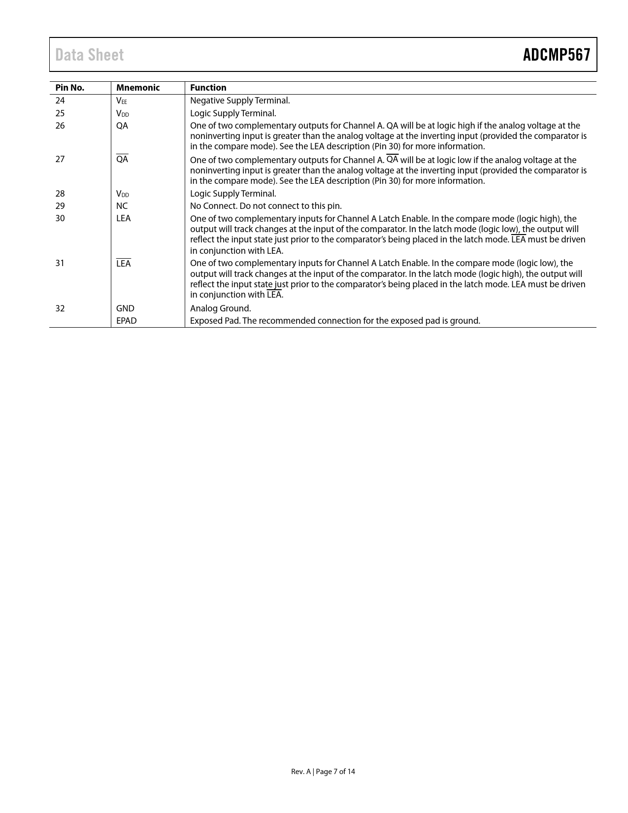 link to page 7 link to page 7 Data SheetADCMP567Pin No.MnemonicFunction 24 VEE Negative Supply Terminal. 25 VDD Logic Supply Terminal. 26 QA One of two complementary outputs for Channel A. QA will be at logic high if the analog voltage at the noninverting input is greater than the analog voltage at the inverting input (provided the comparator is in the compare mode). See the LEA description (Pin 30) for more information. 27 QA One of two complementary outputs for Channel A. QA will be at logic low if the analog voltage at the noninverting input is greater than the analog voltage at the inverting input (provided the comparator is in the compare mode). See the LEA description (Pin 30) for more information. 28 VDD Logic Supply Terminal. 29 NC No Connect. Do not connect to this pin. 30 LEA One of two complementary inputs for Channel A Latch Enable. In the compare mode (logic high), the output will track changes at the input of the comparator. In the latch mode (logic low), the output will reflect the input state just prior to the comparator’s being placed in the latch mode. LEA must be driven in conjunction with LEA. 31 LEA One of two complementary inputs for Channel A Latch Enable. In the compare mode (logic low), the output will track changes at the input of the comparator. In the latch mode (logic high), the output will reflect the input state just prior to the comparator’s being placed in the latch mode. LEA must be driven in conjunction with LEA. 32 GND Analog Ground. EPAD Exposed Pad. The recommended connection for the exposed pad is ground. Rev. A | Page 7 of 14 Document Outline FEATURES APPLICATIONS FUNCTIONAL BLOCK DIAGRAM GENERAL DESCRIPTION TABLE OF CONTENTS REVISION HISTORY SPECIFICATIONS ELECTRICAL CHARACTERISTICS ABSOLUTE MAXIMUM RATINGS THERMAL CONSIDERATIONS ESD CAUTION PIN CONFIGURATION AND FUNCTION DESCRIPTIONS TIMING INFORMATION APPLICATIONS INFORMATION CLOCK TIMING RECOVERY OPTIMIZING HIGH SPEED PERFORMANCE COMPARATOR PROPAGATION DELAY DISPERSION COMPARATOR HYSTERESIS MINIMUM INPUT SLEW RATE REQUIREMENT TYPICAL APPLICATION CIRCUITS TYPICAL PERFORMANCE CHARACTERISTICS OUTLINE DIMENSIONS ORDERING GUIDE