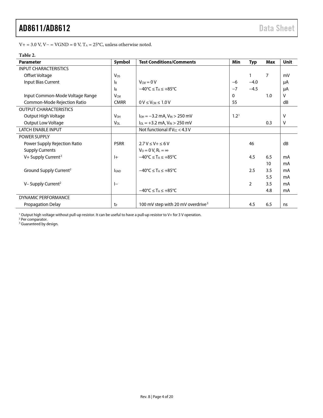 AD8611/AD8612. Data Sheet. Table 2. Parameter. Symbol. Test Conditions/Comments. Min. Typ. Max. Unit