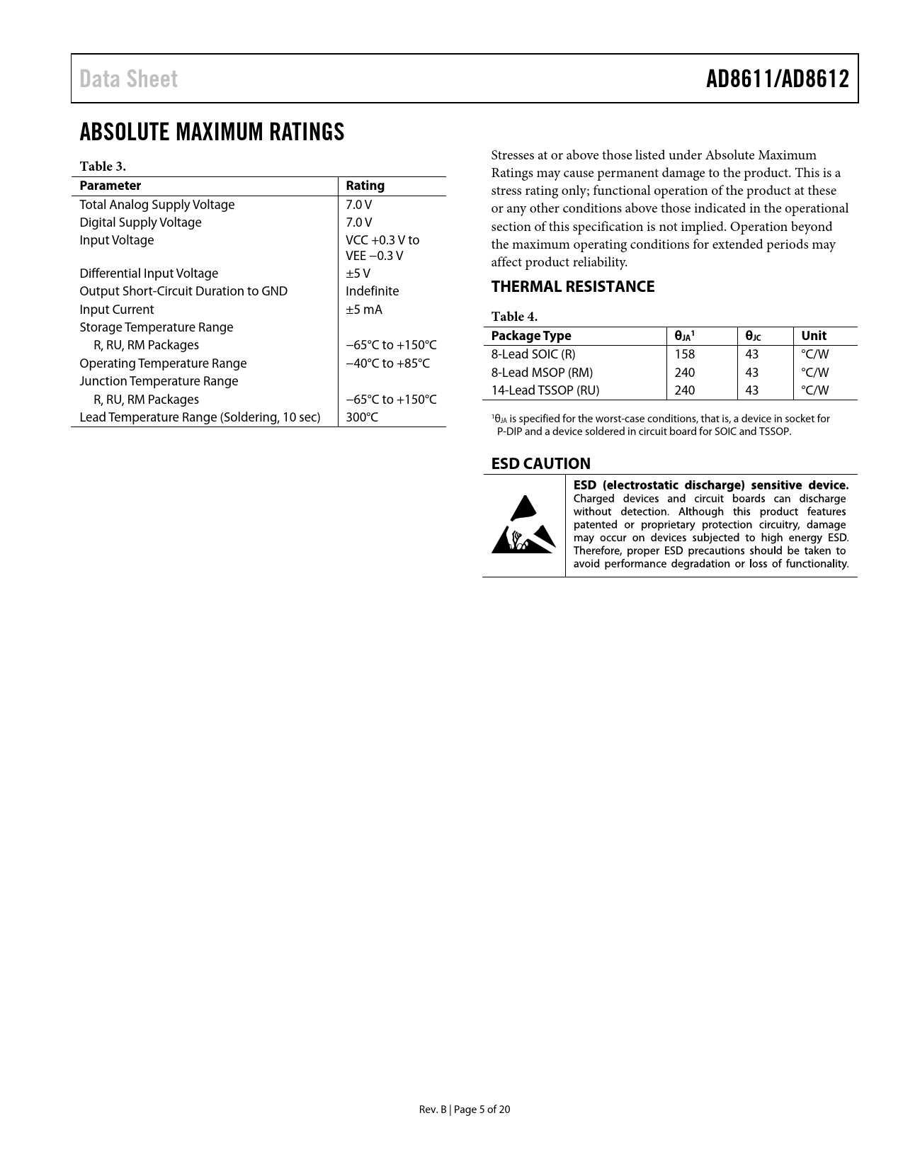 Data SheetAD8611/AD8612ABSOLUTE MAXIMUM RATINGS Stresses at or above those listed under Absolute Maximum Table 3. Ratings may cause permanent damage to the product. This is a ParameterRating stress rating only; functional operation of the product at these Total Analog Supply Voltage 7.0 V or any other conditions above those indicated in the operational Digital Supply Voltage 7.0 V section of this specification is not implied. Operation beyond Input Voltage VCC +0.3 V to the maximum operating conditions for extended periods may VEE −0.3 V affect product reliability. Differential Input Voltage ±5 V Output Short-Circuit Duration to GND Indefinite THERMAL RESISTANCE Input Current ±5 mA Table 4. Storage Temperature Range Package Typeθ 1θ R, RU, RM Packages −65°C to +150°C JAJCUnit 8-Lead SOIC (R) 158 43 °C/W Operating Temperature Range −40°C to +85°C 8-Lead MSOP (RM) 240 43 °C/W Junction Temperature Range 14-Lead TSSOP (RU) 240 43 °C/W R, RU, RM Packages −65°C to +150°C Lead Temperature Range (Soldering, 10 sec) 300°C 1θJA is specified for the worst-case conditions, that is, a device in socket for P-DIP and a device soldered in circuit board for SOIC and TSSOP. ESD CAUTION Rev. B | Page 5 of 20 Document Outline FEATURES APPLICATIONS PIN CONFIGURATIONS GENERAL DESCRIPTION REVISION HISTORY SPECIFICATIONS ABSOLUTE MAXIMUM RATINGS THERMAL RESISTANCE ESD CAUTION PIN CONFIGURATIONS AND FUNCTION DESCRIPTIONS TYPICAL PERFORMANCE CHARACTERISTICS APPLICATIONS INFORMATION OPTIMIZING HIGH SPEED PERFORMANCE UPGRADING THE LT1394 AND LT1016 MAXIMUM INPUT FREQUENCY AND OVERDRIVE OUTPUT LOADING CONSIDERATIONS USING THE LATCHTO MAINTAIN A CONSTANT OUTPUT INPUT STAGE AND BIAS CURRENTS USING HYSTERESIS CLOCK TIMING RECOVERY A 5 V, HIGH SPEED WINDOW COMPARATOR OUTLINE DIMENSIONS ORDERING GUIDE
