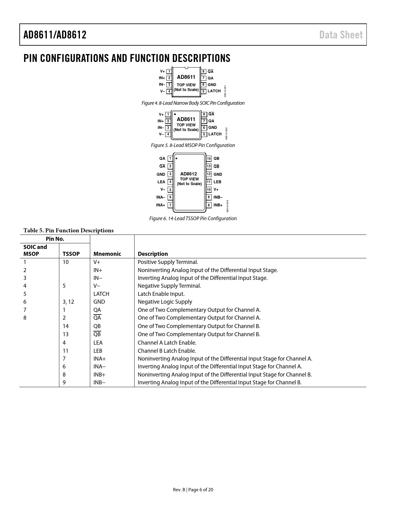 AD8611/AD8612 Data Sheet PIN CONFIGURATIONS AND FUNCTION DESCRIPTIONS V+ 1 IN+ 2 AD8611 IN– 3 TOP VIEW GND (Not to Scale) LATCH
