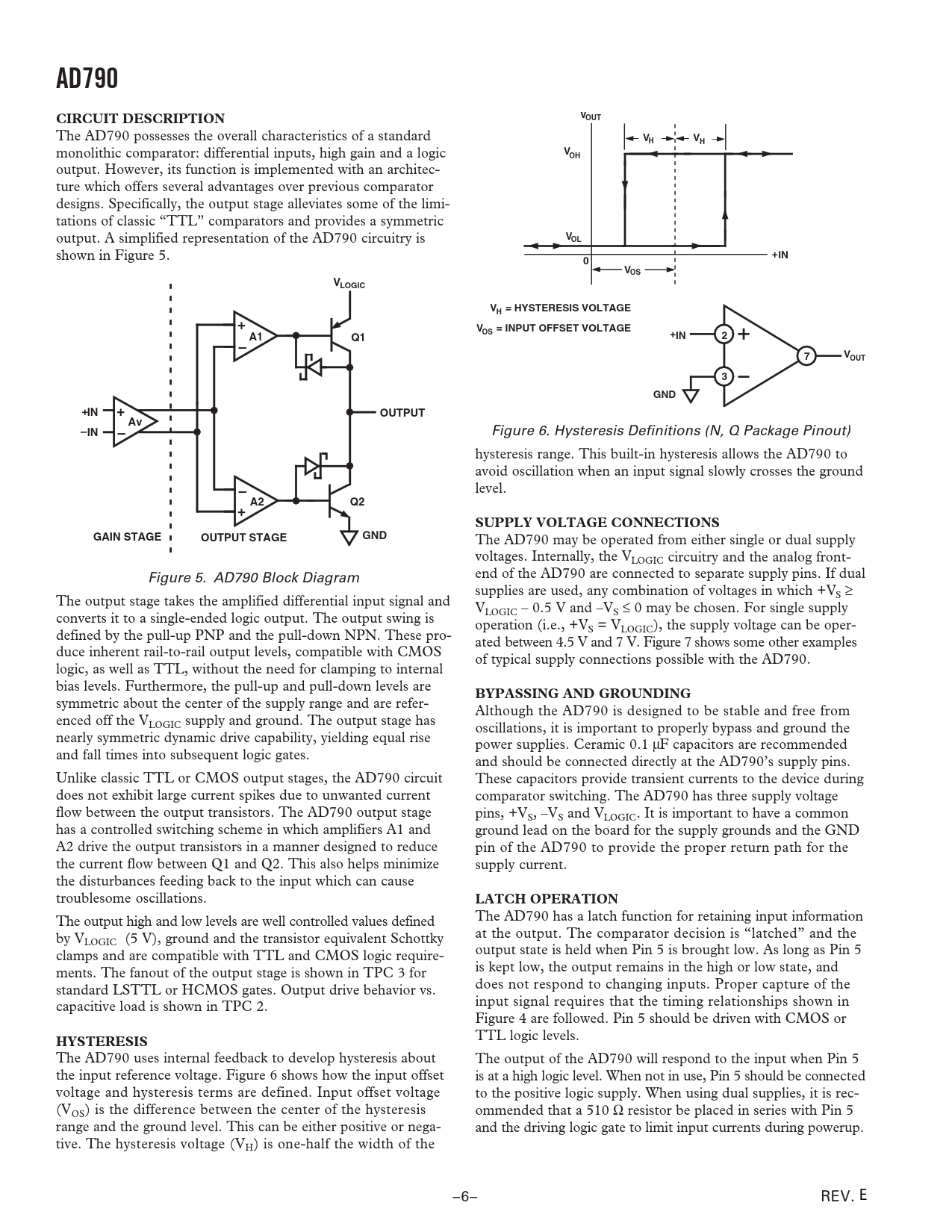 AD790CIRCUIT DESCRIPTIONVOUT The AD790 possesses the overall characteristics of a standard VHVH monolithic comparator: differential inputs, high gain and a logic VOH output. However, its function is implemented with an architec- ture which offers several advantages over previous comparator designs. Specifically, the output stage alleviates some of the limi- tations of classic “TTL” comparators and provides a symmetric output. A simplified representation of the AD790 circuitry is VOL shown in Figure 5. +IN0VOSVLOGICV = HYSTERESIS VOLTAGEH+V= INPUT OFFSET VOLTAGEA1OSQ1IN+2–7VOUT3GNDIN++OUTPUTAv–IN– Figure 6. Hysteresis Definitions (N, Q Package Pinout) hysteresis range. This built-in hysteresis allows the AD790 to avoid oscillation when an input signal slowly crosses the ground – level. A2Q2+SUPPLY VOLTAGE CONNECTIONSGAIN STAGEOUTPUT STAGEGND The AD790 may be operated from either single or dual supply voltages. Internally, the VLOGIC circuitry and the analog front- Figure 5. AD790 Block Diagram end of the AD790 are connected to separate supply pins. If dual supplies are used, any combination of voltages in which +V The output stage takes the amplified differential input signal and S ≥ V converts it to a single-ended logic output. The output swing is LOGIC – 0.5 V and –VS ≤ 0 may be chosen. For single supply operation (i.e., +V defined by the pull-up PNP and the pull-down NPN. These pro- S = VLOGIC), the supply voltage can be oper- ated between 4.5 V and 7 V. Figure 7 shows some other examples duce inherent rail-to-rail output levels, compatible with CMOS of typical supply connections possible with the AD790. logic, as well as TTL, without the need for clamping to internal bias levels. Furthermore, the pull-up and pull-down levels are BYPASSING AND GROUNDING symmetric about the center of the supply range and are refer- Although the AD790 is designed to be stable and free from enced off the VLOGIC supply and ground. The output stage has oscillations, it is important to properly bypass and ground the nearly symmetric dynamic drive capability, yielding equal rise power supplies. Ceramic 0.1 µF capacitors are recommended and fall times into subsequent logic gates. and should be connected directly at the AD790’s supply pins. Unlike classic TTL or CMOS output stages, the AD790 circuit These capacitors provide transient currents to the device during does not exhibit large current spikes due to unwanted current comparator switching. The AD790 has three supply voltage flow between the output transistors. The AD790 output stage pins, +VS, –VS and VLOGIC. It is important to have a common has a controlled switching scheme in which amplifiers A1 and ground lead on the board for the supply grounds and the GND A2 drive the output transistors in a manner designed to reduce pin of the AD790 to provide the proper return path for the the current flow between Q1 and Q2. This also helps minimize supply current. the disturbances feeding back to the input which can cause troublesome oscillations. LATCH OPERATION The output high and low levels are well controlled values defined The AD790 has a latch function for retaining input information by V at the output. The comparator decision is “latched” and the LOGIC (5 V), ground and the transistor equivalent Schottky clamps and are compatible with TTL and CMOS logic require- output state is held when Pin 5 is brought low. As long as Pin 5 ments. The fanout of the output stage is shown in TPC 3 for is kept low, the output remains in the high or low state, and standard LSTTL or HCMOS gates. Output drive behavior vs. does not respond to changing inputs. Proper capture of the capacitive load is shown in TPC 2. input signal requires that the timing relationships shown in Figure 4 are followed. Pin 5 should be driven with CMOS or HYSTERESIS TTL logic levels. The AD790 uses internal feedback to develop hysteresis about The output of the AD790 will respond to the input when Pin 5 the input reference voltage. Figure 6 shows how the input offset is at a high logic level. When not in use, Pin 5 should be connected voltage and hysteresis terms are defined. Input offset voltage to the positive logic supply. When using dual supplies, it is rec- (VOS) is the difference between the center of the hysteresis ommended that a 510 Ω resistor be placed in series with Pin 5 range and the ground level. This can be either positive or nega- and the driving logic gate to limit input currents during powerup. tive. The hysteresis voltage (VH) is one-half the width of the –6– REV. E