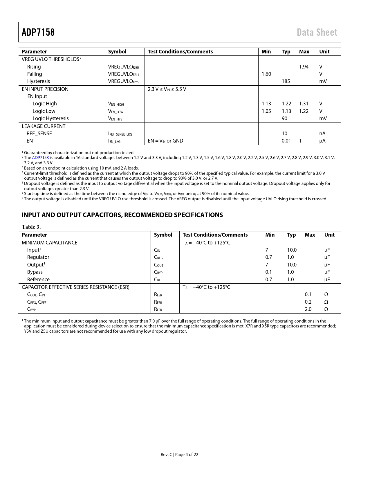 页数 / 页22 / 4 — ADP7158. Data Sheet. Parameter. Symbol. Test Conditions/Comments. Min. …