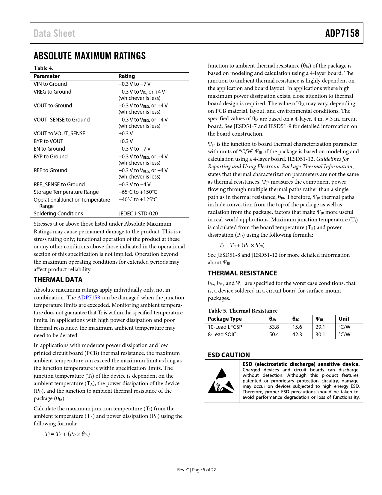 Data Sheet ADP7158 ABSOLUTE MAXIMUM RATINGS Table 4 Parameter Rating THERMAL RESISTANCE THERMAL DATA