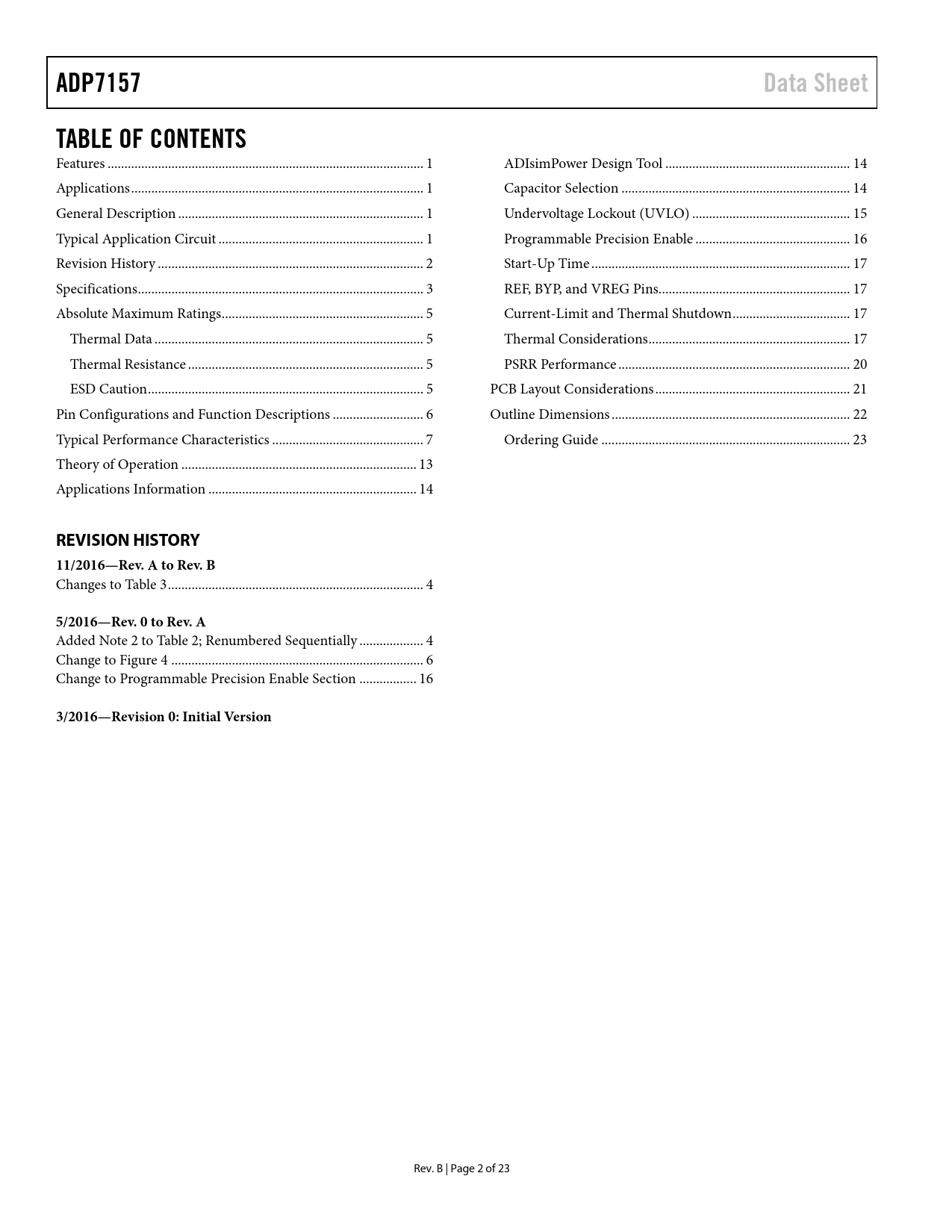 link to page 1 link to page 1 link to page 1 link to page 1 link to page 2 link to page 3 link to page 5 link to page 5 link to page 5 link to page 5 link to page 6 link to page 7 link to page 13 link to page 14 link to page 14 link to page 14 link to page 15 link to page 16 link to page 17 link to page 17 link to page 17 link to page 17 link to page 20 link to page 21 link to page 22 link to page 23 ADP7157Data SheetTABLE OF CONTENTS Features .. 1 ADIsimPower Design Tool ... 14 Applications ... 1 Capacitor Selection .. 14 General Description ... 1 Undervoltage Lockout (UVLO) ... 15 Typical Application Circuit ... 1 Programmable Precision Enable .. 16 Revision History ... 2 Start-Up Time ... 17 Specifications ... 3 REF, BYP, and VREG Pins... 17 Absolute Maximum Ratings .. 5 Current-Limit and Thermal Shutdown ... 17 Thermal Data .. 5 Thermal Considerations .. 17 Thermal Resistance .. 5 PSRR Performance ... 20 ESD Caution .. 5 PCB Layout Considerations .. 21 Pin Configurations and Function Descriptions ... 6 Outline Dimensions ... 22 Typical Performance Characteristics ... 7 Ordering Guide .. 23 Theory of Operation .. 13 Applications Information .. 14 REVISION HISTORY 11/2016—Rev. A to Rev. B Changes to Table 3 .. 4 5/2016—Rev. 0 to Rev. A Added Note 2 to Table 2; Renumbered Sequential y ... 4 Change to Figure 4 ... 6 Change to Programmable Precision Enable Section ... 16 3/2016—Revision 0: Initial Version Rev. B | Page 2 of 23 Document Outline FEATURES APPLICATIONS GENERAL DESCRIPTION TYPICAL APPLICATION CIRCUIT REVISION HISTORY SPECIFICATIONS ABSOLUTE MAXIMUM RATINGS THERMAL DATA THERMAL RESISTANCE ESD CAUTION PIN CONFIGURATIONS AND FUNCTION DESCRIPTIONS TYPICAL PERFORMANCE CHARACTERISTICS THEORY OF OPERATION APPLICATIONS INFORMATION ADIsimPOWER DESIGN TOOL CAPACITOR SELECTION Output Capacitor Input and VREG Capacitor REF Capacitor BYP Capacitor Capacitor Properties UNDERVOLTAGE LOCKOUT (UVLO) PROGRAMMABLE PRECISION ENABLE START-UP TIME REF, BYP, AND VREG PINS CURRENT-LIMIT AND THERMAL SHUTDOWN THERMAL CONSIDERATIONS Thermal Characterization Parameter (ΨJB) PSRR PERFORMANCE PCB LAYOUT CONSIDERATIONS OUTLINE DIMENSIONS ORDERING GUIDE