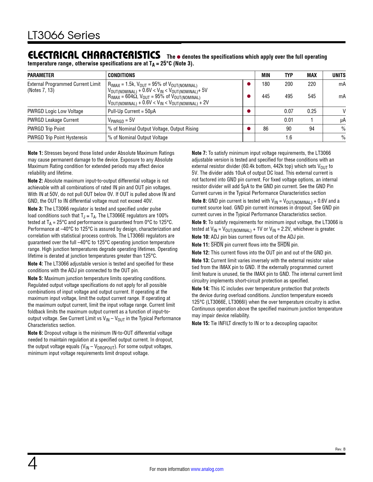 link to page 2 link to page 5 link to page 5 link to page 5 link to page 5 LT3066 Series ELECTRICAL CHARACTERISTICSThe l denotes the specifications which apply over the full operatingtemperature range, otherwise specifications are at TA = 25°C (Note 3).PARAMETERCONDITIONSMINTYPMAXUNITS External Programmed Current Limit RIMAX = 1.5k, VOUT = 95% of VOUT(NOMINAL) l 180 200 220 mA (Notes 7, 13) VOUT(NOMINAL) + 0.6V < VIN < VOUT(NOMINAL)+ 5V RIMAX = 604Ω, VOUT = 95% of VOUT(NOMINAL) l 445 495 545 mA VOUT(NOMINAL) + 0.6V < VIN < VOUT(NOMINAL) + 2V PWRGD Logic Low Voltage Pull-Up Current = 50µA l 0.07 0.25 V PWRGD Leakage Current VPWRGD = 5V 0.01 1 µA PWRGD Trip Point % of Nominal Output Voltage, Output Rising l 86 90 94 % PWRGD Trip Point Hysteresis % of Nominal Output Voltage 1.6 % Note 1: Stresses beyond those listed under Absolute Maximum Ratings Note 7: To satisfy minimum input voltage requirements, the LT3066 may cause permanent damage to the device. Exposure to any Absolute adjustable version is tested and specified for these conditions with an Maximum Rating condition for extended periods may affect device external resistor divider (60.4k bottom, 442k top) which sets VOUT to reliability and lifetime. 5V. The divider adds 10uA of output DC load. This external current is Note 2: Absolute maximum input-to-output differential voltage is not not factored into GND pin current. For fixed voltage options, an internal achievable with all combinations of rated IN pin and OUT pin voltages. resistor divider will add 5μA to the GND pin current. See the GND Pin With IN at 50V, do not pull OUT below 0V. If OUT is pulled above IN and Current curves in the Typical Performance Characteristics section GND, the OUT to IN differential voltage must not exceed 40V. Note 8: GND pin current is tested with VIN = VOUT(NOMINAL) + 0.6V and a Note 3: The LT3066 regulator is tested and specified under pulse current source load. GND pin current increases in dropout. See GND pin load conditions such that T current curves in the Typical Performance Characteristics section. J ≅ TA. The LT3066E regulators are 100% tested at TA = 25°C and performance is guaranteed from 0°C to 125°C. Note 9: To satisfy requirements for minimum input voltage, the LT3066 is Performance at –40°C to 125°C is assured by design, characterization and tested at VIN = VOUT(NOMINAL) + 1V or VIN = 2.2V, whichever is greater. correlation with statistical process controls. The LT3066I regulators are Note 10: ADJ pin bias current flows out of the ADJ pin. guaranteed over the full –40°C to 125°C operating junction temperature Note 11: SHDN pin current flows into the SHDN pin. range. High junction temperatures degrade operating lifetimes. Operating lifetime is derated at junction temperatures greater than 125°C. Note 12: This current flows into the OUT pin and out of the GND pin. Note 4: The LT3066 adjustable version is tested and specified for these Note 13: Current limit varies inversely with the external resistor value conditions with the ADJ pin connected to the OUT pin. tied from the IMAX pin to GND. If the externally programmed current limit feature is unused, tie the IMAX pin to GND. The internal current limit Note 5: Maximum junction temperature limits operating conditions. circuitry implements short-circuit protection as specified. Regulated output voltage specifications do not apply for all possible combinations of input voltage and output current. If operating at the Note 14: This IC includes over temperature protection that protects maximum input voltage, limit the output current range. If operating at the device during overload conditions. Junction temperature exceeds the maximum output current, limit the input voltage range. Current limit 125°C (LT3066E, LT3066I) when the over temperature circuitry is active. foldback limits the maximum output current as a function of input-to- Continuous operation above the specified maximum junction temperature output voltage. See Current Limit vs V may impair device reliability. IN – VOUT in the Typical Performance Characteristics section. Note 15: Tie INFILT directly to IN or to a decoupling capacitor. Note 6: Dropout voltage is the minimum IN-to-OUT differential voltage needed to maintain regulation at a specified output current. In dropout, the output voltage equals (VIN – VDROPOUT). For some output voltages, minimum input voltage requirements limit dropout voltage. Rev. B 4 For more information www.analog.com Document Outline Features Applications Typical Application Description Absolute Maximum Ratings Pin Configuration Order Information Electrical Characteristics Typical Performance Characteristics Pin Functions Block Diagram Applications Information Typical Applications Package Description Revision History Typical Application Related Parts