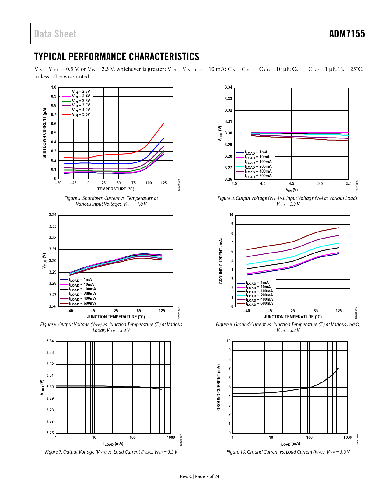 3.34 10 9 3.33 8 3.32 A) 7 (m 3.31 T N 6 (V) RE T 3.30 5 OUV 4 3.29 ND CUR U O ILOAD = 1mA R 3 3.28 I G I LOAD = 10mA LOAD = 1mA I I 2 LOAD = 10mA LOAD = 100mA ILOAD = 100mA 3.27 ILOAD = 200mA ILOAD = 200mA I 1 LOAD = 400mA ILOAD = 400mA ILOAD = 600mA I 3.26 0 LOAD = 600mA –40 –5 25 85 125