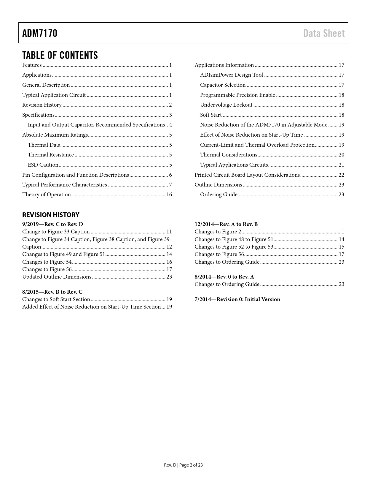 页数 / 页23 / 2 — ADM7170. Data Sheet. TABLE OF CONTENTS. REVISION HISTORY 9/2019—Rev. C to …