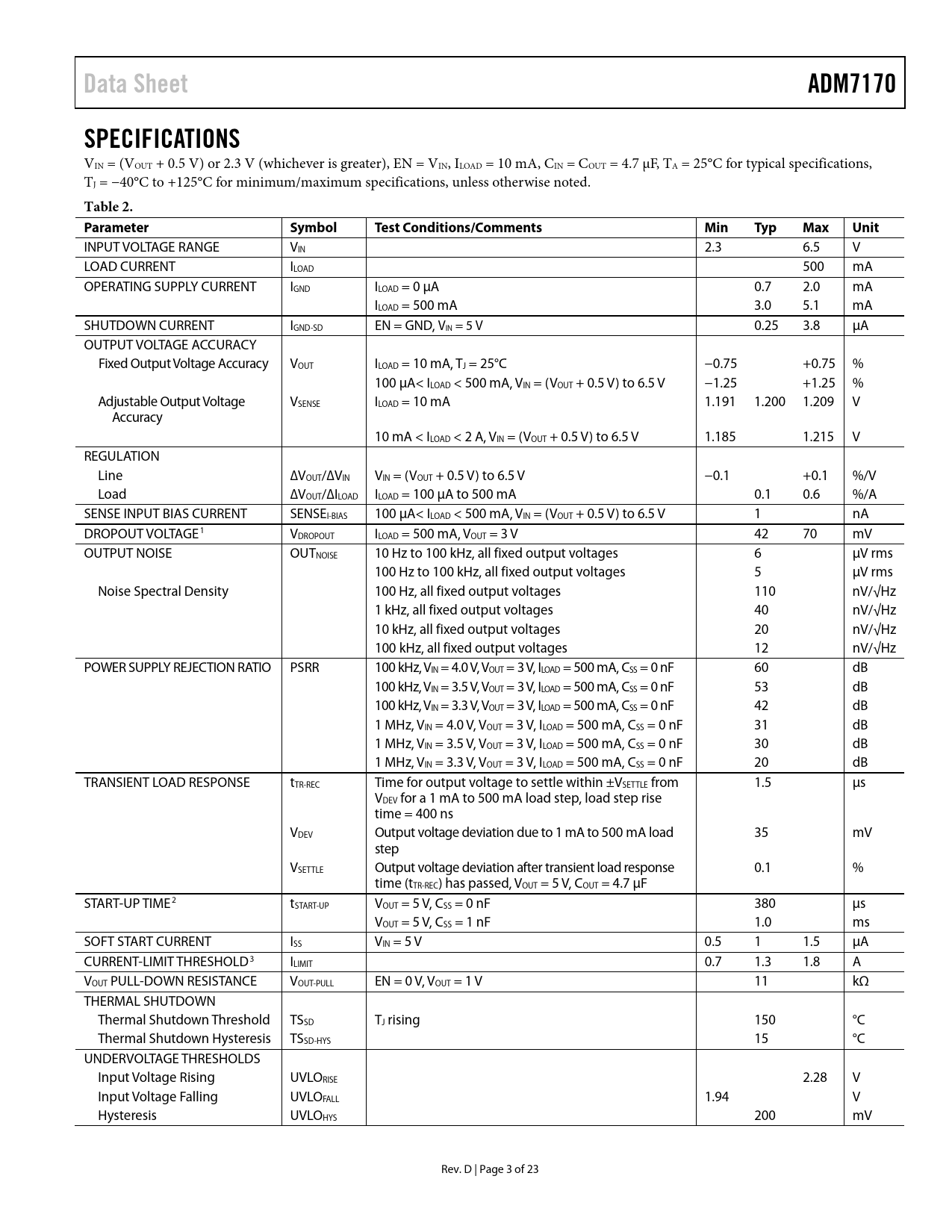 | 页数 / 页 | 23 / 3 — Data Sheet. ADM7170. SPECIFICATIONS. Table 2. Parameter. Symbol. Test … |