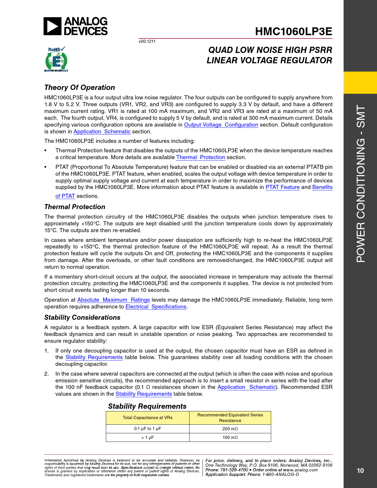 HMC1060LP3E v00.1211 QUAD LOW NOISE HIGH PSRRLINEAR VOLTAGE REGULATORTheory Of Operation HMC1060LP3e is a four output ultra low noise regulator. the four outputs can be configured to supply anywhere from 1.8 V to 5.2 V. three outputs (Vr1, Vr2, and Vr3) are configured to supply 3.3 V by default, and have a different maximum current rating. Vr1 is rated at 100 mA maximum, and Vr2 and Vr3 are rated at a maximum of 50 mA t each. the fourth output, Vr4, is configured to supply 5 V by default, and is rated at 300 mA maximum current. details M specifying various configuration options are available in output Voltage Configuration section. default configuration is shown in Application Schematic section. the HMC1060LP3e includes a number of features including: g - S • thermal Protection feature that disables the outputs of the HMC1060LP3e when the device temperature reaches a critical temperature. More details are available thermal Protection section. in n • PtAt (Proportional to Absolute temperature) feature that can be enabled or disabled via an external PtAtB pin of the HMC1060LP3e. PtAt feature, when enabled, scales the output voltage with device temperature in order to io supply optimal supply voltage and current at each temperature in order to maximize the performance of devices it supplied by the HMC1060LP3e. More information about PtAt feature is available in PtAt Feature and Benefits d of PtAt sections. n Thermal Protection o the thermal protection circuitry of the HMC1060LP3e disables the outputs when junction temperature rises to approximately +150°C. the outputs are kept disabled until the junction temperature cools down by approximately 15°C. the outputs are then re-enabled. r C e in cases where ambient temperature and/or power dissipation are sufficiently high to re-heat the HMC1060LP3e repeatedly to +150°C, the thermal protection feature of the HMC1060LP3e will repeat. As a result the thermal w protection feature will cycle the outputs on and off, protecting the HMC1060LP3e and the components it supplies o from damage. After the overloads, or other fault conditions are removed/changed, the HMC1060LP3e output will P return to normal operation. if a momentary short-circuit occurs at the output, the associated increase in temperature may activate the thermal protection circuitry, protecting the HMC1060LP3e and the components it supplies. the device is not protected from short circuit events lasting longer than 10 seconds. operation at Absolute Maximum ratings levels may damage the HMC1060LP3e immediately. reliable, long term operation requires adherence to electrical Specifications. Stability Considerations A regulator is a feedback system. A large capacitor with low eSr (equivalent Series resistance) may affect the feedback dynamics and can result in unstable operation or noise peaking. two approaches are recommended to ensure regulator stability: 1. if only one decoupling capacitor is used at the output, the chosen capacitor must have an eSr as defined in the Stability requirements table below. this guarantees stability over al loading conditions with the chosen decoupling capacitor. 2. in the case where several capacitors are connected at the output (which is often the case with noise and spurious emission sensitive circuits), the recommended approach is to insert a small resistor in series with the load after the 100 nF feedback capacitor (0.1 Ω resistances shown in the Application Schematic). recommended eSr values are shown in the Stability requirements table below. Stability Requirements recommended equivalent Series total Capacitance at Vrx resistance 0.1 µF to 1 µF 200 mΩ > 1 µF 100 mΩ Inf F or o m r p atio r n ifc ur e n , d ishe e d lbiv y e A r n y a alog n D d t evic o p es is la beclie o eved rd to ebre sa: H ccur iattti e tae M nd re ilicarbloew . H a o ve C wever, o n rp o For price, delivery, and to place orders: Analog Devices, Inc., responsibility is assumed by Analog Devices for its use, nor for any infringements of patents or other oration, 2 Elizabeth Drive, Chelmsford, MA 01824 One Technology Way, P.O. Box 9106, Norwood, MA 02062-9106 Phone: 978-250-3343 Fax: 978-250-3373 O rights of third parties that may result from its use. Specifications subject to change without notice. No P rd ho e ne r O : 7 n 81- -3li 2n 9 e a -47 t w 0 w 0 • O w rd .h e it r o tniltie n .c e ao t m license is granted by implication or otherwise under any patent or patent rights of Analog Devices. www.analog.com 10 Application Support: Pho Trademarks and registered trademarks are the property of their respective owners. ne: 978-250-33 A 4 p 3 o plica r a tio p n S p u s p @ po h rt itt : P ite ho . n c e o : 1m -800-ANALOG-D