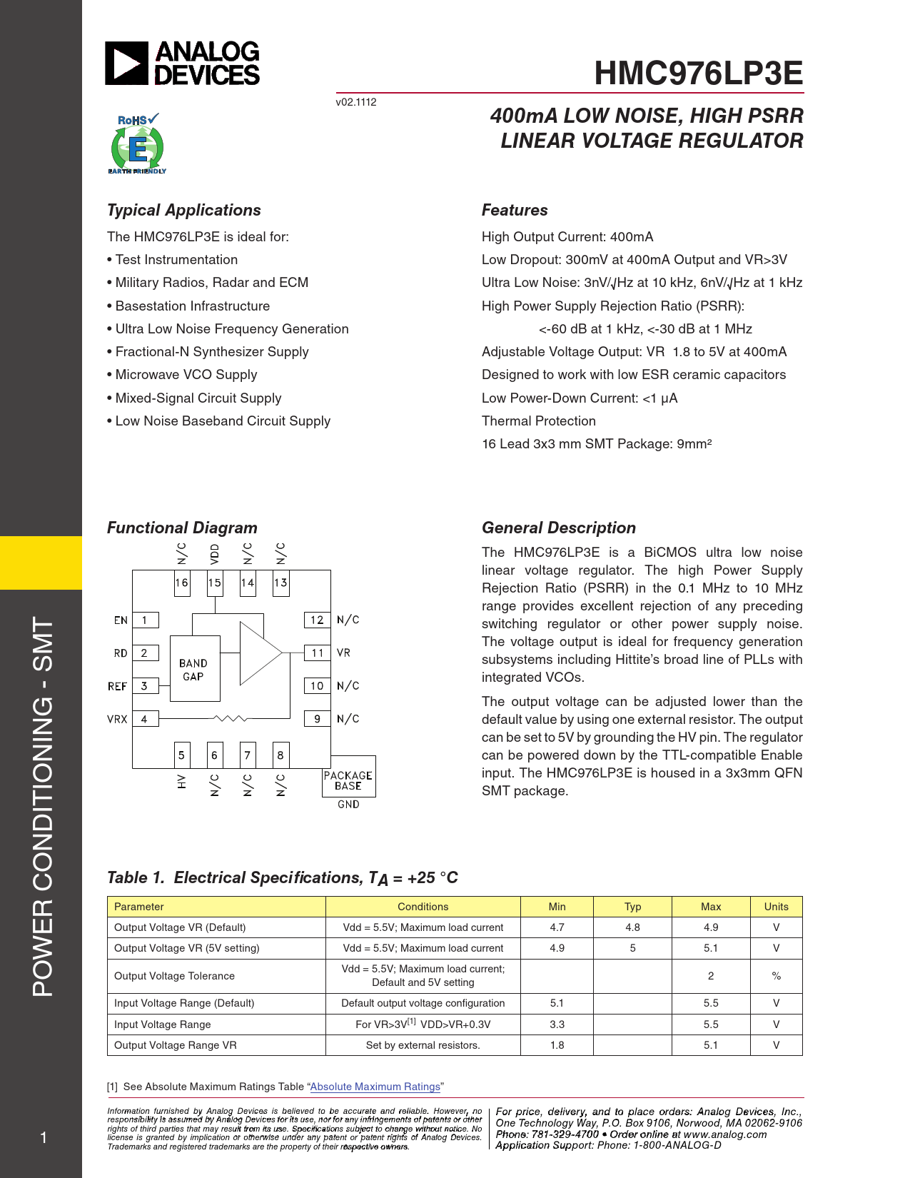 HMC976LP3E v02.1112 400mA LOW NOISE, HIGH PSRRLINEAR VOLTAGE REGULATORTypical ApplicationsFeatures The HMC976LP3E is ideal for: High Output Current: 400mA • Test Instrumentation Low Dropout: 300mV at 400mA Output and VR>3V • Military Radios, Radar and ECM Ultra Low Noise: 3nV/√Hz at 10 kHz, 6nV/√Hz at 1 kHz • Basestation Infrastructure High Power Supply Rejection Ratio (PSRR): • Ultra Low Noise Frequency Generation <-60 dB at 1 kHz, <-30 dB at 1 MHz • Fractional-N Synthesizer Supply Adjustable Voltage Output: VR 1.8 to 5V at 400mA • Microwave VCO Supply Designed to work with low ESR ceramic capacitors • Mixed-Signal Circuit Supply Low Power-Down Current: <1 µA • Low Noise Baseband Circuit Supply Thermal Protection 16 Lead 3x3 mm SMT Package: 9mm² Functional DiagramGeneral Description The HMC976LP3E is a BiCMOS ultra low noise linear voltage regulator. The high Power Supply Rejection Ratio (PSRR) in the 0.1 MHz to 10 MHz range provides excel ent rejection of any preceding T switching regulator or other power supply noise. M The voltage output is ideal for frequency generation subsystems including Hittite’s broad line of PLLs with integrated VCOs. G - S The output voltage can be adjusted lower than the IN default value by using one external resistor. The output can be set to 5V by grounding the HV pin. The regulator N can be powered down by the TTL-compatible Enable IO input. The HMC976LP3E is housed in a 3x3mm QFN IT SMT package. D N O Table 1. Electrical Specifications, TA = +25 °C R C Parameter Conditions Min Typ Max Units E Output Voltage VR (Default) Vdd = 5.5V; Maximum load current 4.7 4.8 4.9 V W Output Voltage VR (5V setting) Vdd = 5.5V; Maximum load current 4.9 5 5.1 V O Vdd = 5.5V; Maximum load current; P Output Voltage Tolerance 2 % Default and 5V setting Input Voltage Range (Default) Default output voltage configuration 5.1 5.5 V Input Voltage Range For VR>3V[1] VDD>VR+0.3V 3.3 5.5 V Output Voltage Range VR Set by external resistors. 1.8 5.1 V [1] See Absolute Maximum Ratings Table “Absolute Maximum Ratings” Info F rmoatr p ion rfiucrneis, d hed ebliy vAenraly a og n De d t vice o p s is lbaelciee o ved rtd o e b r e sa: H ccur iattte ite M and reliicarbloew . H aove C wever, o n r o For price, delivery, and to place orders: Analog Devices, Inc., responsibility is assumed by Analog Devices for its use, nor for any infringements of patents or other poration, 2 Elizabeth Drive, Chelmsford, MA 01824 One Technology Way, P.O. Box 9106, Norwood, MA 02062-9106 1 978-250-3343 tel • 978-250-3373 fax • O rights of third parties that may result from its use. Specifications subject to change without notice. No rd P e h r O one n : 7 -li 81n - e a 329- t w 470 ww.h 0 • O it rd t e ite r o . n c li o n m license is granted by implication or otherwise under any patent or patent rights of Analog Devices. e at www.analog.com Application S Trademarks and registered trademarks are the property of their respective owners. upport: apps@ A h ppitlitcite ati .oco n Sm upport: Phone: 1-800-ANALOG-D