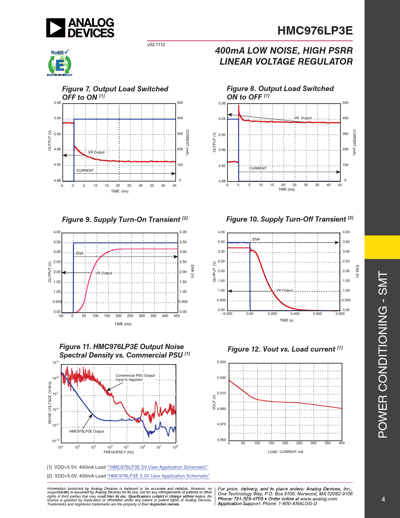HMC976LP3E v02.1112 400mA LOW NOISE, HIGH PSRRLINEAR VOLTAGE REGULATORFigure 7. Output Load SwitchedFigure 8. Output Load SwitchedOFF to ON [1]ON to OFF [1] 5.08 500 5.08 500 5.04 400 5.04 VR Output 400 CURRENT CURRENT (V) 5.00 300 5.00 300 (V) (mA) (mA) OUTPUT 4.96 200 4.96 200 VR Output OUTPUT 4.92 100 4.92 100 CURRENT CURRENT 4.88 0 4.88 0 -5 0 5 10 15 20 25 30 35 40 45 -5 0 5 10 15 20 25 30 35 40 45 TIME (ms) TIME (ms) Figure 9. Supply Turn-On Transient [2]Figure 10. Supply Turn-Off Transient [2] 4.00 4.00 4.00 4.00 ENA 3.50 3.50 3.50 3.50 3.00 3.00 ENA 3.00 3.00 2.50 2.50 2.50 2.50 (V) ENA ( (V) ENA ( 2.00 2.00 2.00 2.00 VR Output V V ) T OUTPUT 1.50 1.50 OUTPUT 1.50 1.50 M 1.00 1.00 1.00 VR Output 1.00 0.500 0.500 0.500 0.500 0.00 0.00 0.00 0.00 -50 0 50 100 150 200 250 300 350 400 450 -0.200 0.00 0.200 0.400 0.600 0.800 G - S TIME (s) TIME (ms) IN N Figure 11. HMC976LP3E Output Noise IO Figure 12. Vout vs. Load current [1]Spectral Density vs. Commercial PSU [1] IT 10-5 5.050 D Commercial PSU Output N 10-6 Input to regulator 5.030 O tHz) /r V 10-7 5.010 ) (V R C 10-8 VOUT 4.990 E NOISE VOLTAGE ( W 10-9 4.970 HMC976LP3E Output O 4.950 P 10-10 0 50 100 150 200 250 300 350 400 101 102 103 104 105 106 107 108 FREQUENCY (Hz) LOAD CURRENT mA [1] VDD=5.5V, 400mA Load ““HMC976LP3E 5V User Application Schematic”. [2] VDD=5.0V, 400mA Load “HMC976LP3E 3.3V User Application Schematic” InfoFro ma r p tion rfiucre nis, d he e d lbiv y e An raly a og n Ded t viceo p s is la be clie o eved rtd o e b re sa: H ccur iattti e te M and re ilicarbloew . a Ho ve C wever, onro For price, delivery, and to place orders: Analog Devices, Inc., responsibility is assumed by Analog Devices for its use, nor for any infringements of patents or other poration, 2 Elizabeth Drive, Chelmsford, MA 01824 One Technology Way, P.O. Box 9106, Norwood, MA 02062-9106 978-250-3343 tel • 978-250-3373 fax • O rights of third parties that may result from its use. Specifications subject to change without notice. No rd P e h r O one n : 7-lin 81- e a 329-t w 47 w 0 w.h 0 • O it rd teite r o .nc li o n m license is granted by implication or otherwise under any patent or patent rights of Analog Devices. e at www.analog.com 4 Application S Trademarks and registered trademarks are the property of their respective owners. upport: apps@ A h p i p tliti c te ati .ocom n Support: Phone: 1-800-ANALOG-D