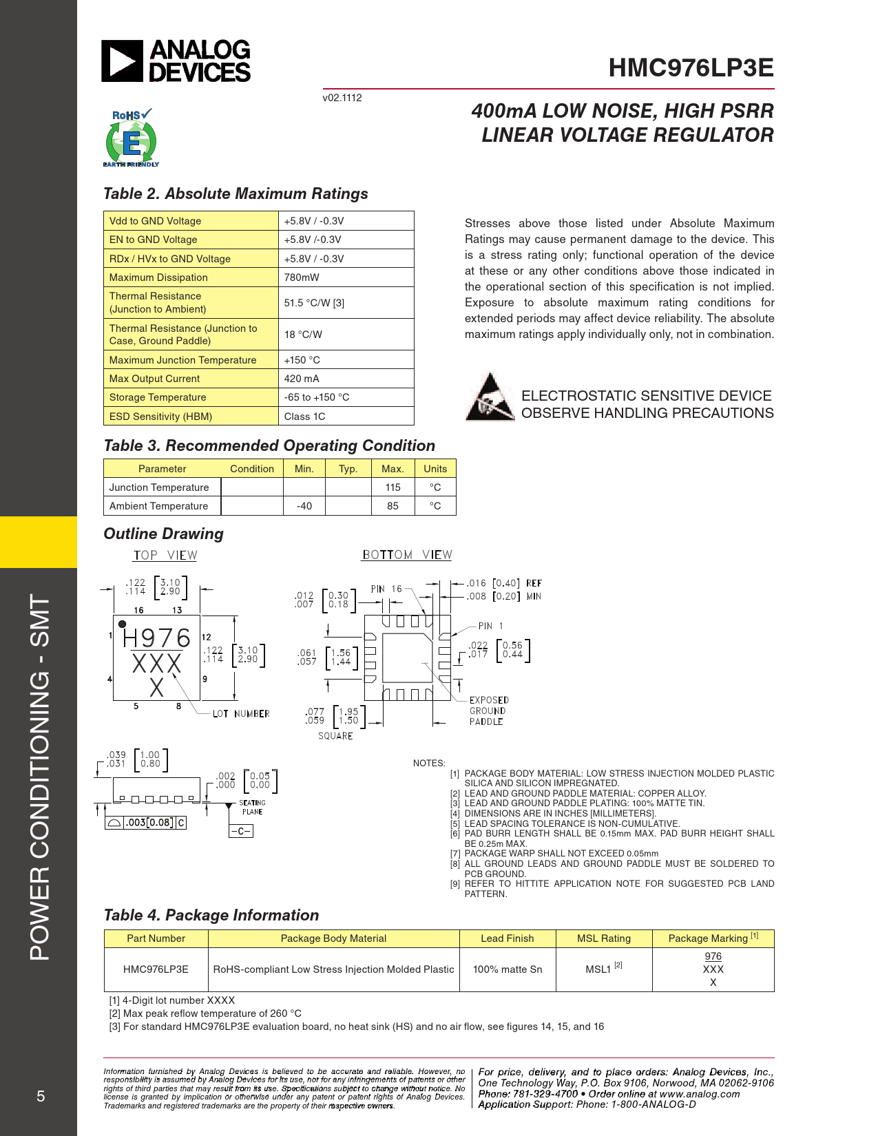 HMC976LP3E. 400mA LOW NOISE, HIGH PSRR. LINEAR VOLTAGE REGULATOR. Table 2. Absolute Maximum Ratings
