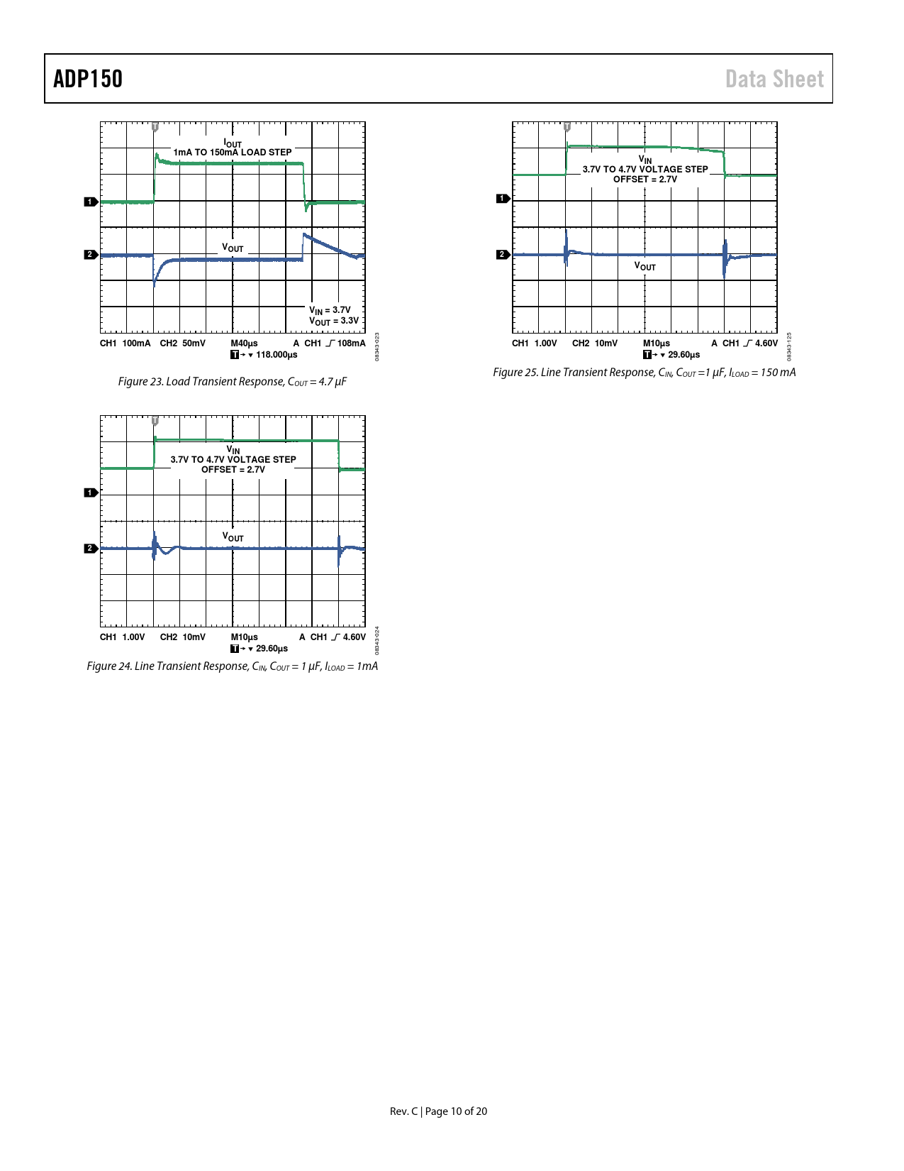 ADP150. Data Sheet. IOUT. 1mA TO 150mA LOAD STEP. VIN. 3.7V TO 4.7V VOLTAGE STEP. OFFSET = 2.7V. VOUT. VIN = 3.7V VOUT = 3.3V. CH1 100mA