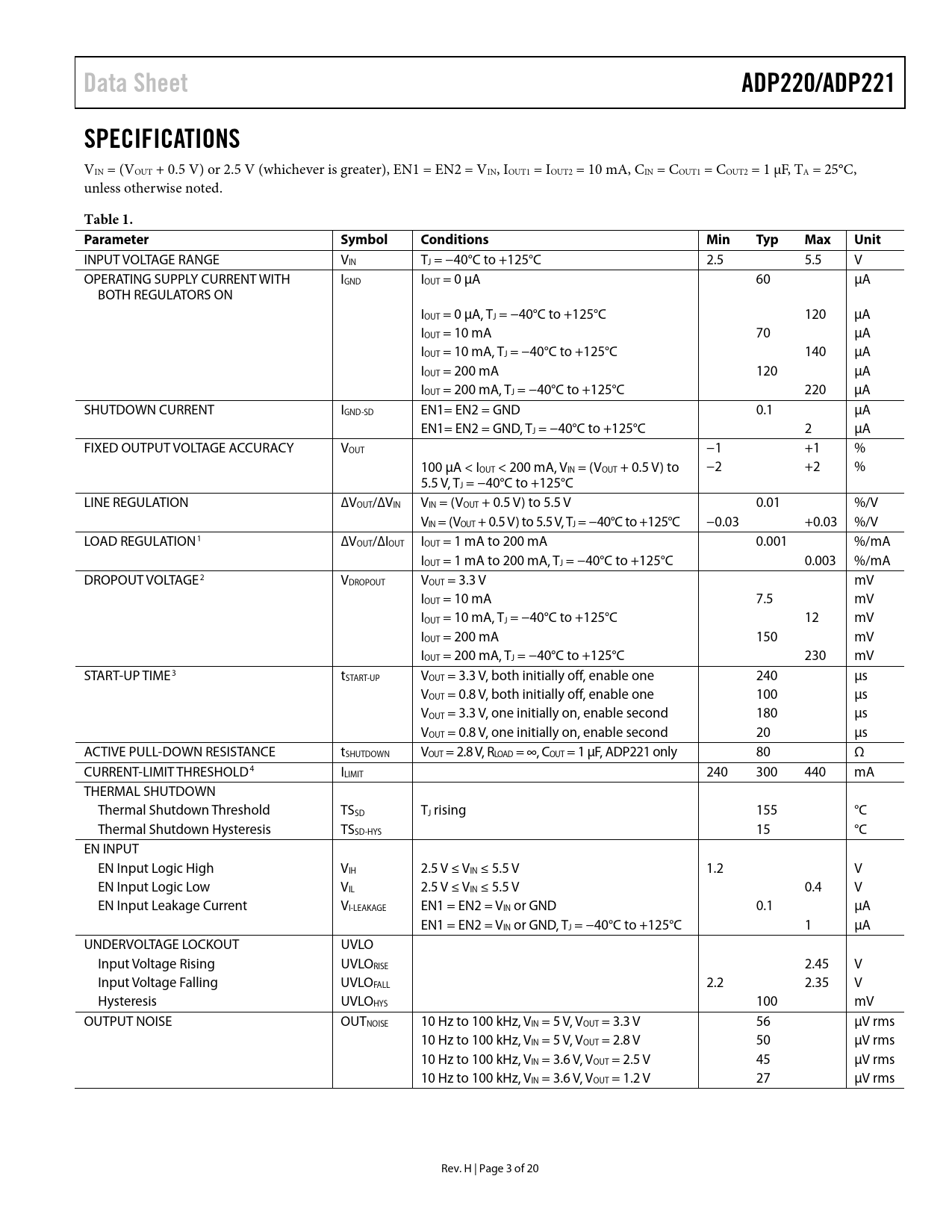 | 页数 / 页 | 20 / 3 — Data Sheet. ADP220/ADP221. SPECIFICATIONS. Table 1. Parameter. Symbol. … |
