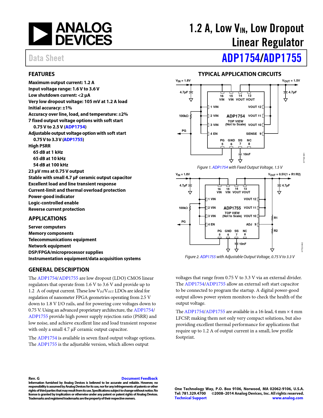1.2 A, Low VIN, Low Dropout. Linear Regulator. Data Sheet. ADP1754/. ADP1755. FEATURES. TYPICAL APPLICATION CIRCUITS