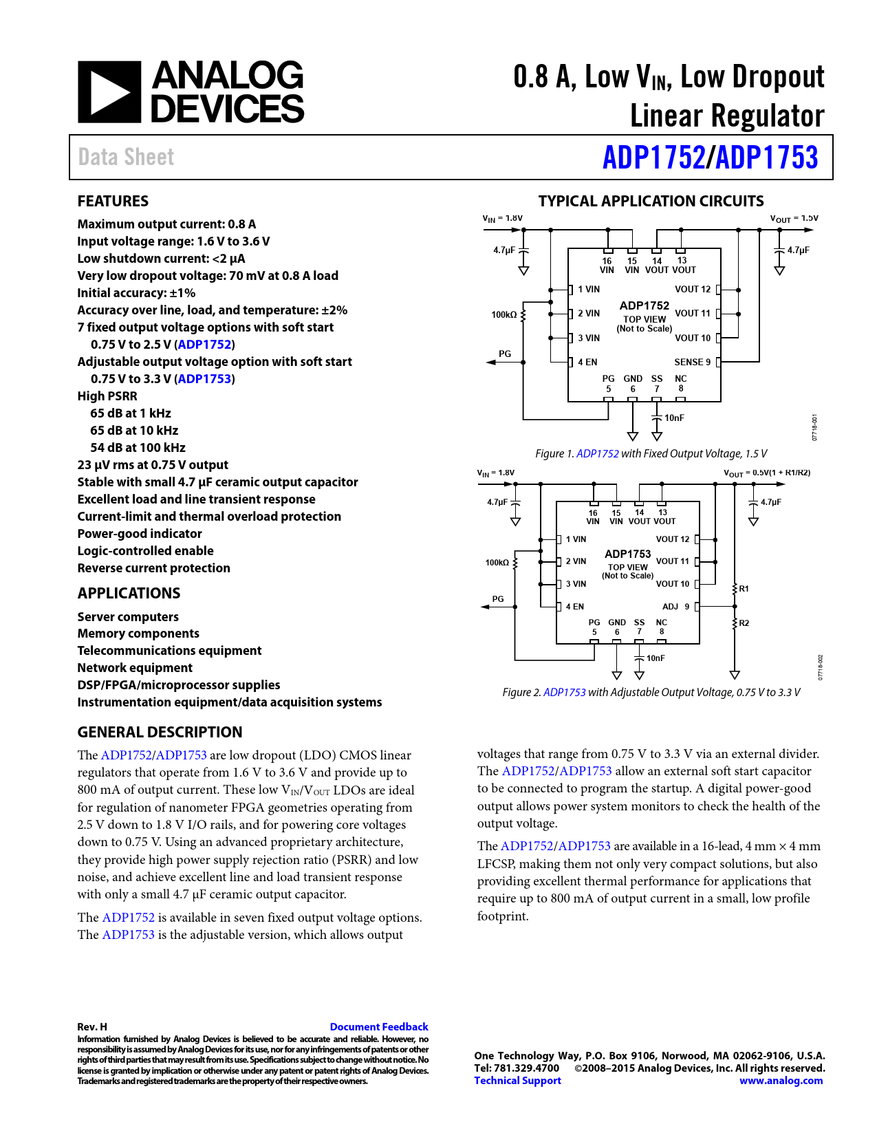 0.8 A, Low VIN, Low Dropout. Linear Regulator. Data Sheet. ADP1752/. ADP1753. FEATURES. TYPICAL APPLICATION CIRCUITS