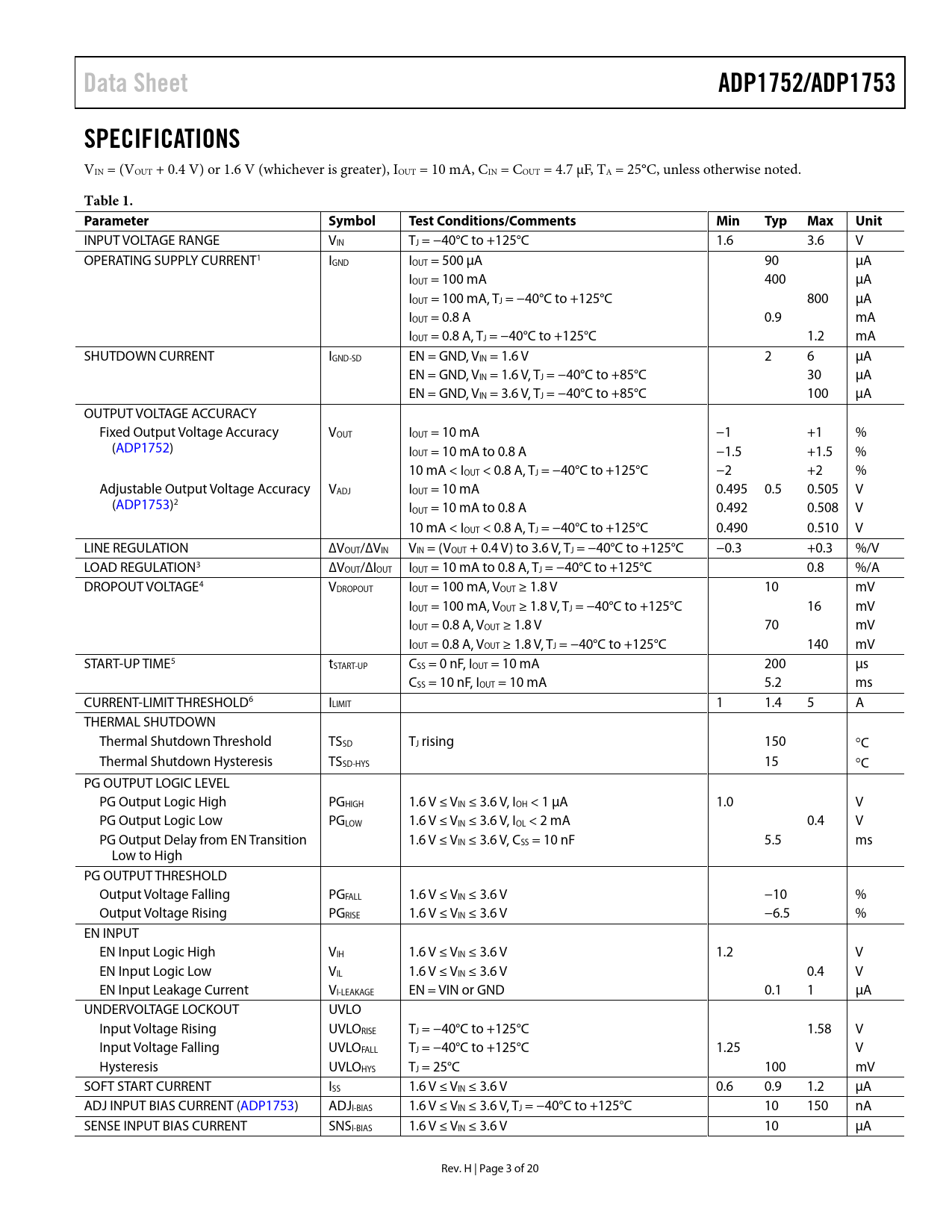 页数 / 页20 / 3 — Data Sheet. ADP1752/ADP1753. SPECIFICATIONS. Table 1. Parameter. Symbol. …