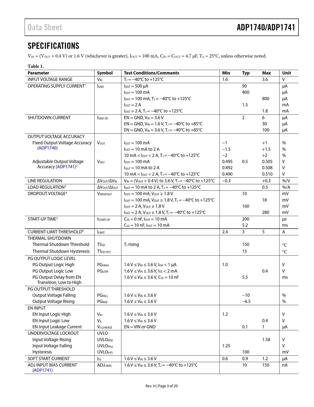 Data Sheet. ADP1740/ADP1741. SPECIFICATIONS. Table 1. Parameter. Symbol. Test Conditions/Comments. Min. Typ. Max. Unit