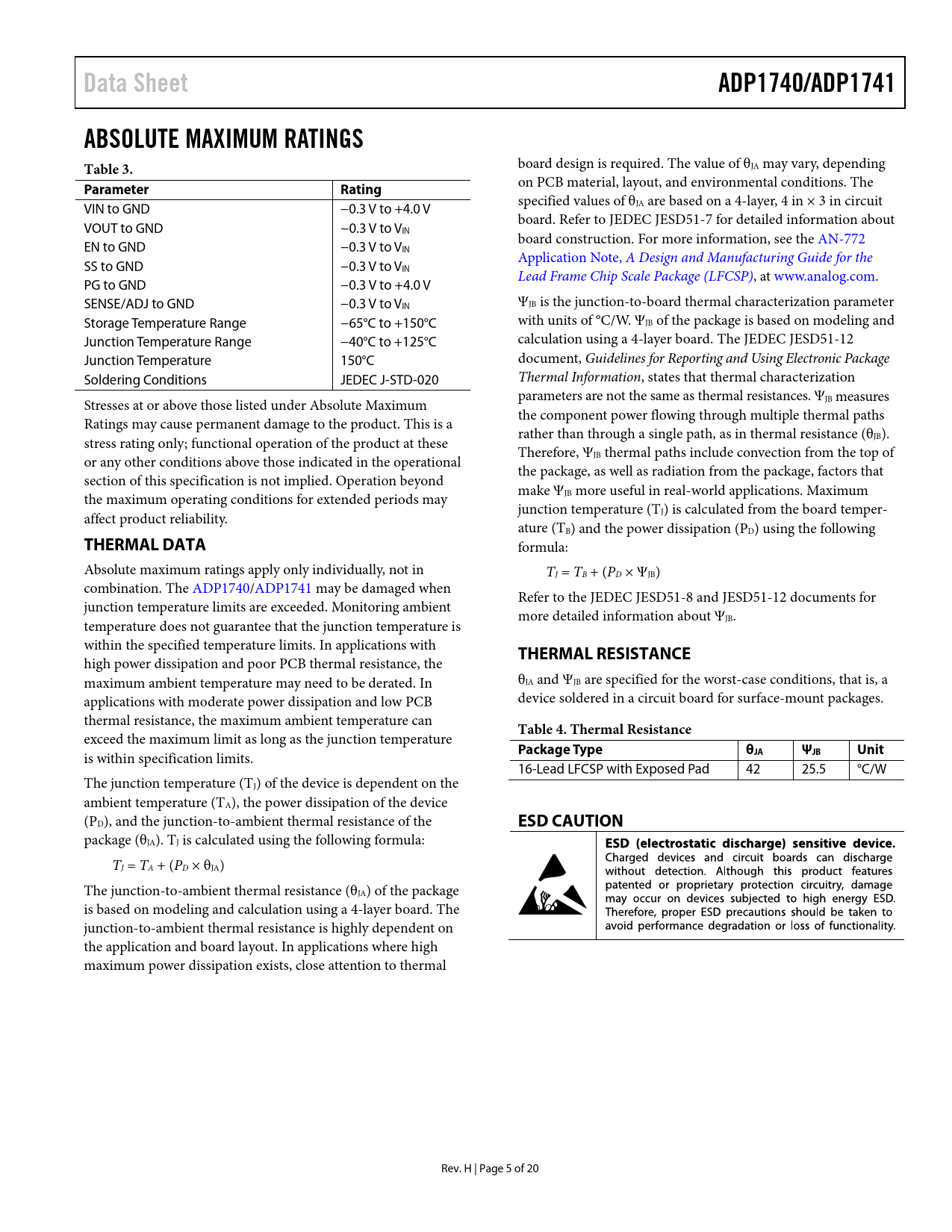 Data SheetADP1740/ADP1741ABSOLUTE MAXIMUM RATINGS Table 3. board design is required. The value of θJA may vary, depending ParameterRating on PCB material, layout, and environmental conditions. The specified values of θ VIN to GND −0.3 V to +4.0 V JA are based on a 4-layer, 4 in × 3 in circuit board. Refer to JEDEC JESD51-7 for detailed information about VOUT to GND −0.3 V to VIN board construction. For more information, see the AN-772 EN to GND −0.3 V to VIN Application Note, A Design and Manufacturing Guide for the SS to GND −0.3 V to VIN Lead Frame Chip Scale Package (LFCSP), at www.analog.com. PG to GND −0.3 V to +4.0 V SENSE/ADJ to GND −0.3 V to VIN ΨJB is the junction-to-board thermal characterization parameter Storage Temperature Range −65°C to +150°C with units of °C/W. ΨJB of the package is based on modeling and Junction Temperature Range −40°C to +125°C calculation using a 4-layer board. The JEDEC JESD51-12 Junction Temperature 150°C document, Guidelines for Reporting and Using Electronic Package Soldering Conditions JEDEC J-STD-020 Thermal Information, states that thermal characterization Stresses at or above those listed under Absolute Maximum parameters are not the same as thermal resistances. ΨJB measures the component power flowing through multiple thermal paths Ratings may cause permanent damage to the product. This is a rather than through a single path, as in thermal resistance (θ stress rating only; functional operation of the product at these JB). Therefore, Ψ or any other conditions above those indicated in the operational JB thermal paths include convection from the top of the package, as wel as radiation from the package, factors that section of this specification is not implied. Operation beyond make Ψ the maximum operating conditions for extended periods may JB more useful in real-world applications. Maximum affect product reliability. junction temperature (TJ) is calculated from the board temper- ature (TB) and the power dissipation (PD) using the following THERMAL DATA formula: Absolute maximum ratings apply only individually, not in TJ = TB + (PD × ΨJB) combination. The ADP1740/ADP1741 may be damaged when Refer to the JEDEC JESD51-8 and JESD51-12 documents for junction temperature limits are exceeded. Monitoring ambient more detailed information about Ψ temperature does not guarantee that the junction temperature is JB. within the specified temperature limits. In applications with THERMAL RESISTANCE high power dissipation and poor PCB thermal resistance, the maximum ambient temperature may need to be derated. In θJA and ΨJB are specified for the worst-case conditions, that is, a applications with moderate power dissipation and low PCB device soldered in a circuit board for surface-mount packages. thermal resistance, the maximum ambient temperature can Table 4. Thermal Resistance exceed the maximum limit as long as the junction temperature is within specification limits. Package TypeθJAΨJBUnit 16-Lead LFCSP with Exposed Pad 42 25.5 °C/W The junction temperature (TJ) of the device is dependent on the ambient temperature (T A), the power dissipation of the device (PD), and the junction-to-ambient thermal resistance of the ESD CAUTION package (θJA). TJ is calculated using the following formula: TJ = TA + (PD × θJA) The junction-to-ambient thermal resistance (θJA) of the package is based on modeling and calculation using a 4-layer board. The junction-to-ambient thermal resistance is highly dependent on the application and board layout. In applications where high maximum power dissipation exists, close attention to thermal Rev. H | Page 5 of 20 Document Outline FEATURES APPLICATIONS TYPICAL APPLICATION CIRCUITS GENERAL DESCRIPTION TABLE OF CONTENTS REVISION HISTORY SPECIFICATIONS INPUT AND OUTPUT CAPACITOR, RECOMMENDED SPECIFICATIONS ABSOLUTE MAXIMUM RATINGS THERMAL DATA THERMAL RESISTANCE ESD CAUTION PIN CONFIGURATIONS AND FUNCTION DESCRIPTIONS TYPICAL PERFORMANCE CHARACTERISTICS THEORY OF OPERATION SOFT START FUNCTION ADJUSTABLE OUTPUT VOLTAGE (ADP1741) ENABLE FEATURE POWER-GOOD FEATURE REVERSE CURRENT PROTECTION FEATURE APPLICATIONS INFORMATION CAPACITOR SELECTION Output Capacitor Input Bypass Capacitor Input and Output Capacitor Properties UNDERVOLTAGE LOCKOUT CURRENT-LIMIT AND THERMAL OVERLOAD PROTECTION THERMAL CONSIDERATIONS PCB LAYOUT CONSIDERATIONS OUTLINE DIMENSIONS ORDERING GUIDE