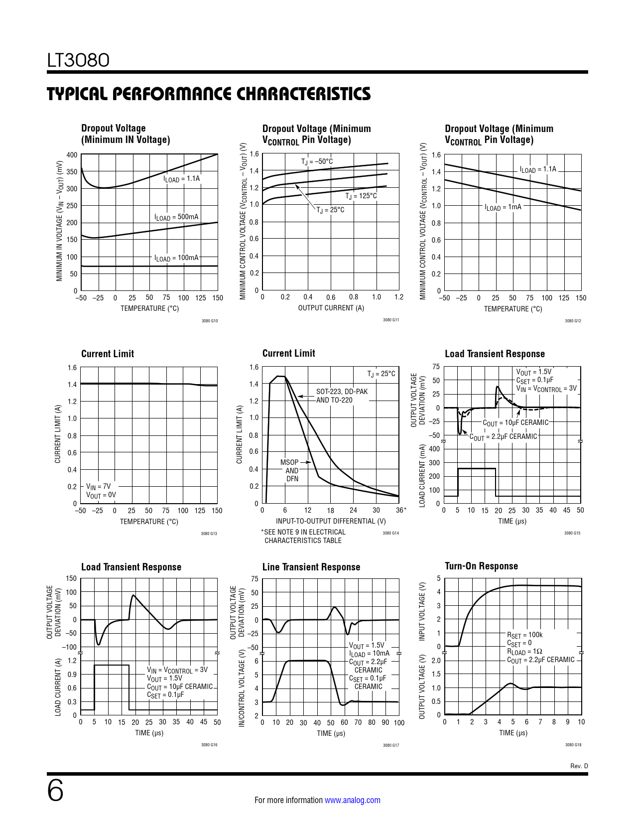 400 ) (V) 1.6 ) (V) 1.6 OUT TJ = –50°C OUT 350 1.4 1.4 ILOAD = 1.1A ) (mV) I – V – V LOAD = 1.1A OUT 300 1.2 1.2 – V T CONTROL J = 125°C CONTROL IN 250 1.0 T 1.0 I J = 25°C LOAD = 1mA I 200 LOAD = 500mA 0.8 0.8 TAGE (V TAGE (V TAGE (V 150 0.6 0.6 100 ILOAD = 100mA 0.4 0.4 50 0.2 0.2 MINIMUM IN VOL 0 0 0 –50 –25 0 25 50 75 100 125 150 MINIMUM CONTROL VOL 0 0.2 0.4 0.6 0.8 1.0 1.2 MINIMUM CONTROL VOL –50 –25 0 25 50 75 100 125 150 TEMPERATURE (°C) OUTPUT CURRENT (A) TEMPERATURE (°C) 3080 G10 3080 G11 3080 G12