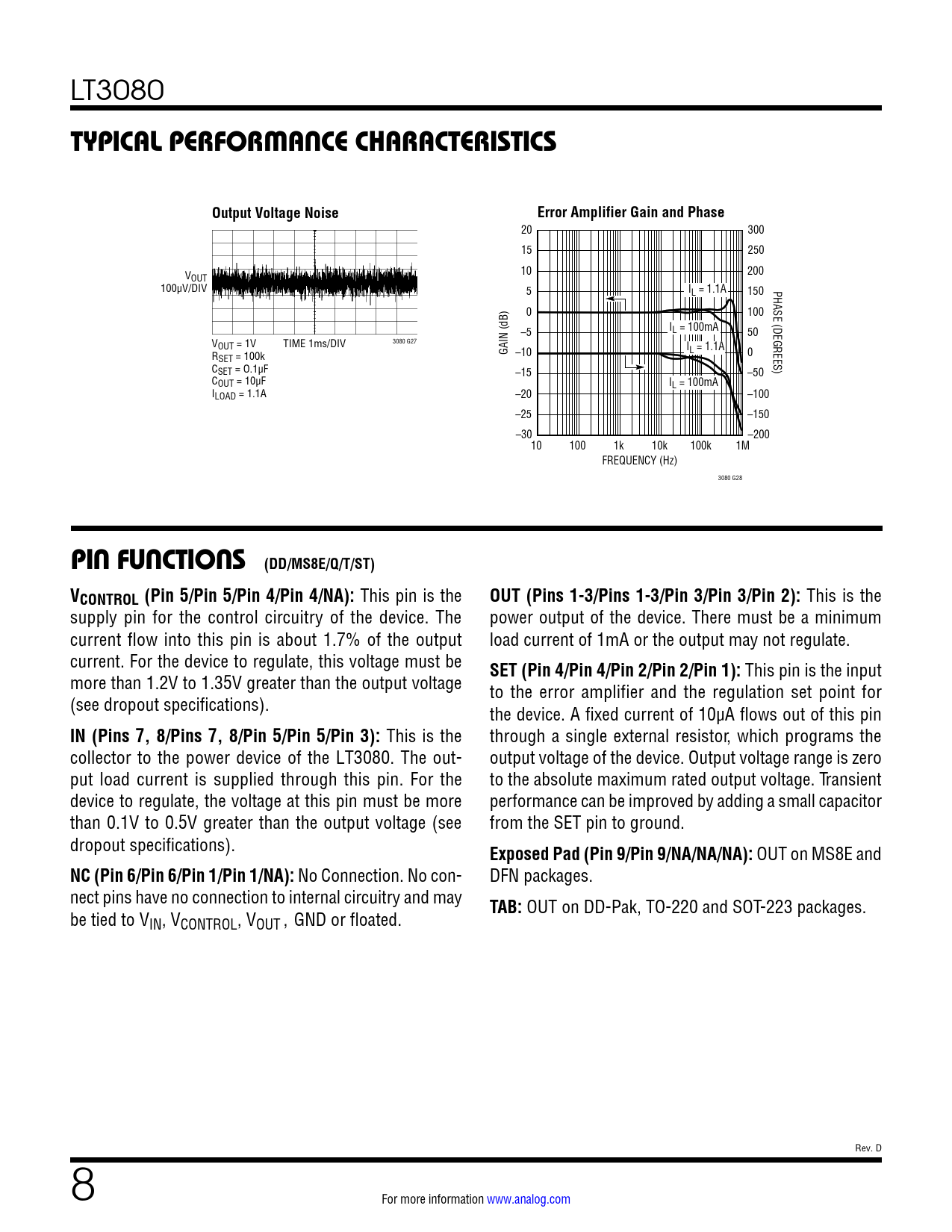 LT3080 TYPICAL PERFORMANCE CHARACTERISTICSOutput Voltage NoiseError Amplifier Gain and Phase 20 300 15 250 V 10 200 OUT 100µV/DIV I PHASE (DEGREES) 5 L = 1.1A 150 0 100 –5 IL = 100mA 50 TIME 1ms/DIV 3080 G27 VOUT = 1V I R GAIN (dB) –10 L = 1.1A 0 SET = 100k CSET = O.1µF –15 –50 COUT = 10µF IL = 100mA ILOAD = 1.1A –20 –100 –25 –150 –30 –200 10 100 1k 10k 100k 1M FREQUENCY (Hz) 3080 G28 PIN FUNCTIONS (DD/MS8E/Q/T/ST)VCONTROL (Pin 5/Pin 5/Pin 4/Pin 4/NA): This pin is the OUT (Pins 1-3/Pins 1-3/Pin 3/Pin 3/Pin 2): This is the supply pin for the control circuitry of the device. The power output of the device. There must be a minimum current flow into this pin is about 1.7% of the output load current of 1mA or the output may not regulate. current. For the device to regulate, this voltage must be SET (Pin 4/Pin 4/Pin 2/Pin 2/Pin 1): This pin is the input more than 1.2V to 1.35V greater than the output voltage to the error amplifier and the regulation set point for (see dropout specifications). the device. A fixed current of 10µA flows out of this pin IN (Pins 7, 8/Pins 7, 8/Pin 5/Pin 5/Pin 3): This is the through a single external resistor, which programs the collector to the power device of the LT3080. The out- output voltage of the device. Output voltage range is zero put load current is supplied through this pin. For the to the absolute maximum rated output voltage. Transient device to regulate, the voltage at this pin must be more performance can be improved by adding a small capacitor than 0.1V to 0.5V greater than the output voltage (see from the SET pin to ground. dropout specifications). Exposed Pad (Pin 9/Pin 9/NA/NA/NA): OUT on MS8E and NC (Pin 6/Pin 6/Pin 1/Pin 1/NA): No Connection. No con- DFN packages. nect pins have no connection to internal circuitry and may TAB: OUT on DD-Pak, TO-220 and SOT-223 packages. be tied to VIN, VCONTROL, VOUT , GND or floated. Rev. D 8 For more information www.analog.com Document Outline Features Applications Typical Application Description Absolute Maximum Ratings Pin Configuration Order Information Electrical Characteristics Typical Performance Characteristics Pin Functions Block Diagram Applications Information Output Voltage Stability and Output Capacitance Paralleling Devices Thermal Performance Quieting the Noise Overload Recovery Load Regulation Thermal Considerations T Package, 5-Lead TO-220 Calculating Junction Temperature Reducing Power Dissipation Typical Applications Package Description Revision History Typical Application Related Parts