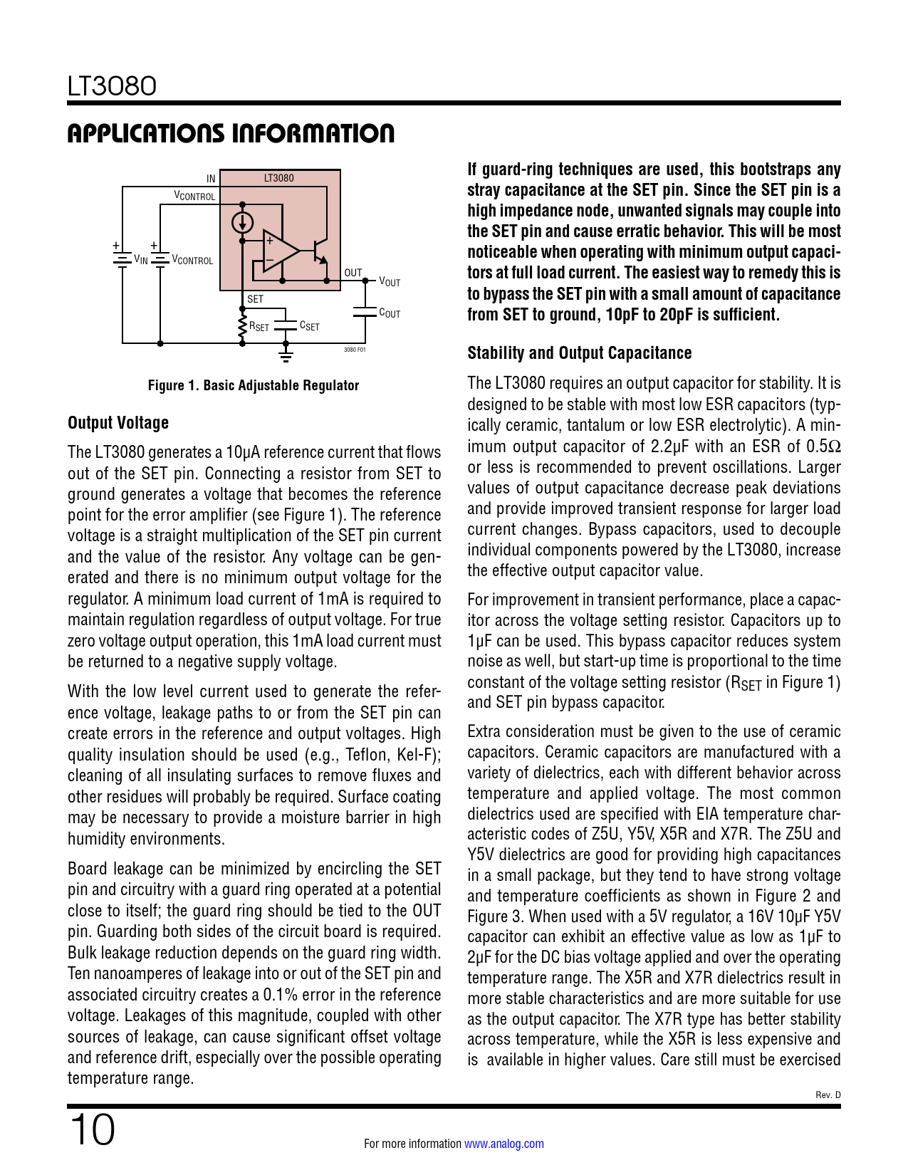 link to page 10 link to page 10 link to page 11 link to page 11 LT3080 APPLICATIONS INFORMATIONIf guard-ring techniques are used, this bootstraps any IN LT3080 V stray capacitance at the SET pin. Since the SET pin is a CONTROL high impedance node, unwanted signals may couple into + the SET pin and cause erratic behavior. This will be most + + noticeable when operating with minimum output capaci- VIN VCONTROL – OUT tors at full load current. The easiest way to remedy this is VOUT SET to bypass the SET pin with a small amount of capacitance COUT from SET to ground, 10pF to 20pF is sufficient. RSET CSET 3080 F01 Stability and Output CapacitanceFigure 1. Basic Adjustable Regulator The LT3080 requires an output capacitor for stability. It is designed to be stable with most low ESR capacitors (typ- Output Voltage ically ceramic, tantalum or low ESR electrolytic). A min- The LT3080 generates a 10µA reference current that flows imum output capacitor of 2.2µF with an ESR of 0.5Ω out of the SET pin. Connecting a resistor from SET to or less is recommended to prevent oscillations. Larger ground generates a voltage that becomes the reference values of output capacitance decrease peak deviations point for the error amplifier (see Figure 1). The reference and provide improved transient response for larger load voltage is a straight multiplication of the SET pin current current changes. Bypass capacitors, used to decouple and the value of the resistor. Any voltage can be gen- individual components powered by the LT3080, increase erated and there is no minimum output voltage for the the effective output capacitor value. regulator. A minimum load current of 1mA is required to For improvement in transient performance, place a capac- maintain regulation regardless of output voltage. For true itor across the voltage setting resistor. Capacitors up to zero voltage output operation, this 1mA load current must 1µF can be used. This bypass capacitor reduces system be returned to a negative supply voltage. noise as well, but start-up time is proportional to the time With the low level current used to generate the refer- constant of the voltage setting resistor (RSET in Figure 1) ence voltage, leakage paths to or from the SET pin can and SET pin bypass capacitor. create errors in the reference and output voltages. High Extra consideration must be given to the use of ceramic quality insulation should be used (e.g., Teflon, Kel-F); capacitors. Ceramic capacitors are manufactured with a cleaning of all insulating surfaces to remove fluxes and variety of dielectrics, each with different behavior across other residues will probably be required. Surface coating temperature and applied voltage. The most common may be necessary to provide a moisture barrier in high dielectrics used are specified with EIA temperature char- humidity environments. acteristic codes of Z5U, Y5V, X5R and X7R. The Z5U and Y5V dielectrics are good for providing high capacitances Board leakage can be minimized by encircling the SET in a small package, but they tend to have strong voltage pin and circuitry with a guard ring operated at a potential and temperature coefficients as shown in Figure 2 and close to itself; the guard ring should be tied to the OUT Figure 3. When used with a 5V regulator, a 16V 10µF Y5V pin. Guarding both sides of the circuit board is required. capacitor can exhibit an effective value as low as 1µF to Bulk leakage reduction depends on the guard ring width. 2µF for the DC bias voltage applied and over the operating Ten nanoamperes of leakage into or out of the SET pin and temperature range. The X5R and X7R dielectrics result in associated circuitry creates a 0.1% error in the reference more stable characteristics and are more suitable for use voltage. Leakages of this magnitude, coupled with other as the output capacitor. The X7R type has better stability sources of leakage, can cause significant offset voltage across temperature, while the X5R is less expensive and and reference drift, especially over the possible operating is available in higher values. Care still must be exercised temperature range. Rev. D 10 For more information www.analog.com Document Outline Features Applications Typical Application Description Absolute Maximum Ratings Pin Configuration Order Information Electrical Characteristics Typical Performance Characteristics Pin Functions Block Diagram Applications Information Output Voltage Stability and Output Capacitance Paralleling Devices Thermal Performance Quieting the Noise Overload Recovery Load Regulation Thermal Considerations T Package, 5-Lead TO-220 Calculating Junction Temperature Reducing Power Dissipation Typical Applications Package Description Revision History Typical Application Related Parts