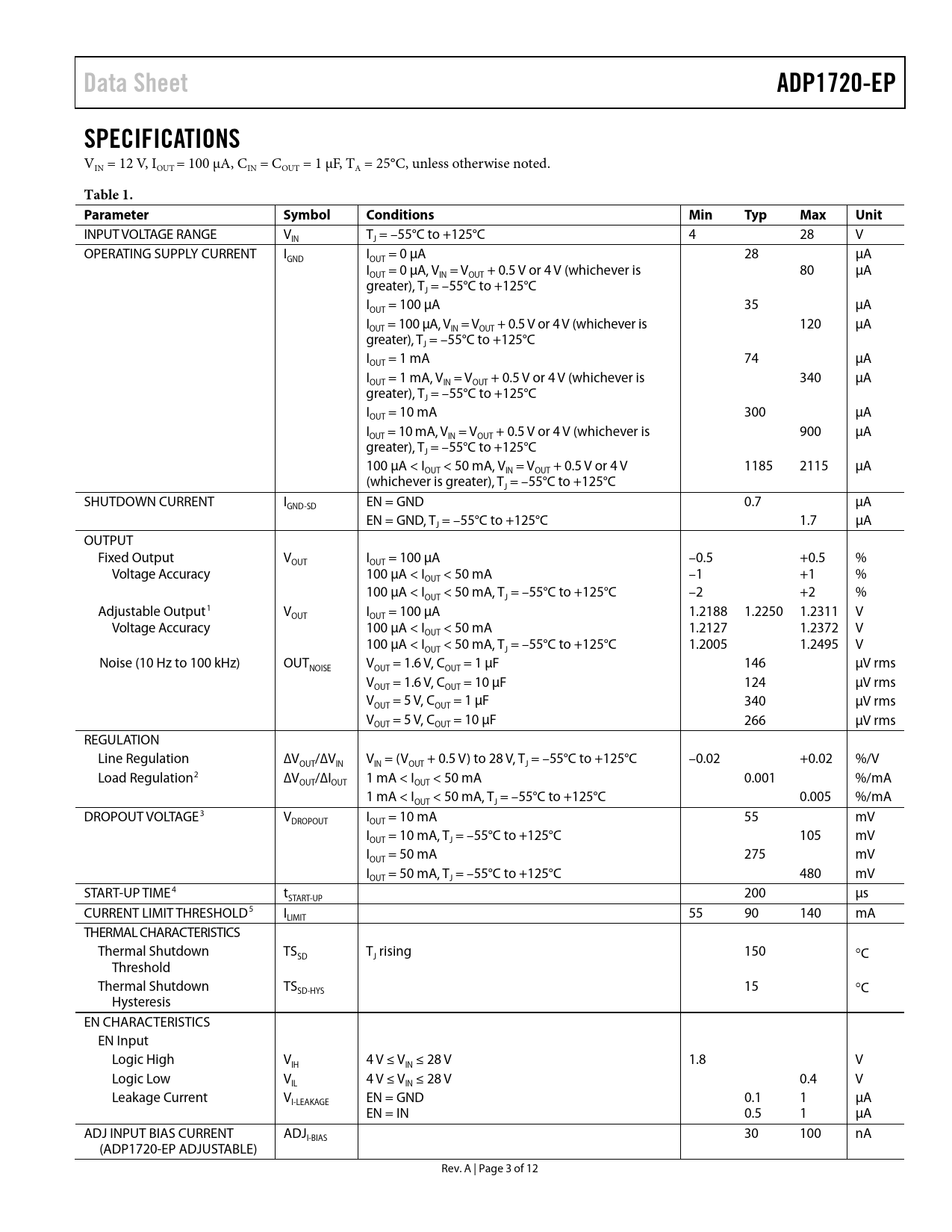 link to page 4 link to page 4 link to page 4 link to page 4 link to page 4 Data SheetADP1720-EPSPECIFICATIONS VIN = 12 V, IOUT = 100 µA, CIN = COUT = 1 µF, TA = 25°C, unless otherwise noted. Table 1. ParameterSymbolConditionsMinTypMaxUnit INPUT VOLTAGE RANGE V T = –55°C to +125°C 4 28 V IN J OPERATING SUPPLY CURRENT I I = 0 µA 28 µA GND OUT I = 0 µA, V = V + 0.5 V or 4 V (whichever is OUT IN OUT 80 µA greater), T = –55°C to +125°C J I = 100 µA 35 µA OUT I = 100 µA, V = V + 0.5 V or 4 V (whichever is 120 µA OUT IN OUT greater), T = –55°C to +125°C J I = 1 mA 74 µA OUT I = 1 mA, V = V + 0.5 V or 4 V (whichever is 340 µA OUT IN OUT greater), T = –55°C to +125°C J I = 10 mA 300 µA OUT I = 10 mA, V = V + 0.5 V or 4 V (whichever is 900 µA OUT IN OUT greater), T = –55°C to +125°C J 100 µA < I < 50 mA, V = V + 0.5 V or 4 V 1185 2115 µA OUT IN OUT (whichever is greater), T = –55°C to +125°C J SHUTDOWN CURRENT I EN = GND 0.7 µA GND-SD EN = GND, T = –55°C to +125°C 1.7 µA J OUTPUT Fixed Output V I = 100 µA –0.5 +0.5 % OUT OUT Voltage Accuracy 100 µA < I < 50 mA –1 +1 % OUT 100 µA < I < 50 mA, T = –55°C to +125°C –2 +2 % OUT J Adjustable Output1 V I = 100 µA 1.2188 1.2250 1.2311 V OUT OUT Voltage Accuracy 100 µA < I < 50 mA 1.2127 1.2372 V OUT 100 µA < I < 50 mA, T = –55°C to +125°C 1.2005 1.2495 V OUT J Noise (10 Hz to 100 kHz) OUT V = 1.6 V, C = 1 µF 146 µV rms NOISE OUT OUT V = 1.6 V, C = 10 µF 124 µV rms OUT OUT V = 5 V, C = 1 µF OUT OUT 340 µV rms V = 5 V, C = 10 µF OUT OUT 266 µV rms REGULATION Line Regulation ∆V /∆V V = (V + 0.5 V) to 28 V, T = –55°C to +125°C –0.02 +0.02 %/V OUT IN IN OUT J Load Regulation2 ∆V /∆I 1 mA < I < 50 mA 0.001 %/mA OUT OUT OUT 1 mA < I < 50 mA, T = –55°C to +125°C 0.005 %/mA OUT J DROPOUT VOLTAGE3 V I = 10 mA 55 mV DROPOUT OUT I = 10 mA, T = –55°C to +125°C 105 mV OUT J I = 50 mA 275 mV OUT I = 50 mA, T = –55°C to +125°C 480 mV OUT J START-UP TIME4 t 200 µs START-UP CURRENT LIMIT THRESHOLD5 I 55 90 140 mA LIMIT THERMAL CHARACTERISTICS Thermal Shutdown TS T rising 150 SD J °C Threshold Thermal Shutdown TS 15 SD-HYS °C Hysteresis EN CHARACTERISTICS EN Input Logic High V 4 V ≤ V ≤ 28 V 1.8 V IH IN Logic Low V 4 V ≤ V ≤ 28 V 0.4 V IL IN Leakage Current V EN = GND 0.1 1 µA I-LEAKAGE EN = IN 0.5 1 µA ADJ INPUT BIAS CURRENT ADJ 30 100 nA I-BIAS (ADP1720-EP ADJUSTABLE) Rev. A | Page 3 of 12 Document Outline Features Enhanced Product Features Applications Typical Application Circuits General Description Revision History Specifications Absolute Maximum Ratings Thermal Resistance ESD Caution Pin Configurations and Function Descriptions Typical Performance Characteristics Applications Information Thermal Considerations Outline Dimensions Ordering Guide