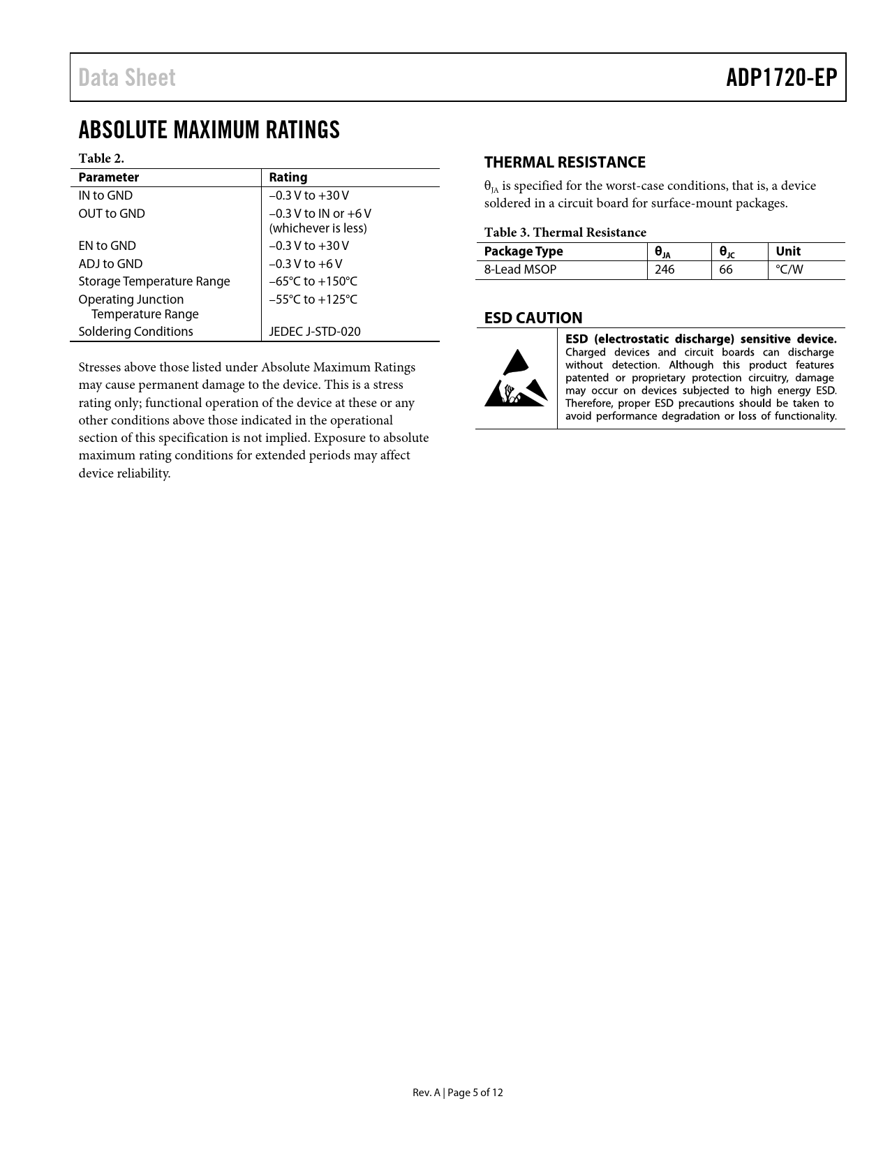 Data Sheet. ADP1720-EP. ABSOLUTE MAXIMUM RATINGS Table 2. THERMAL RESISTANCE. Parameter. Rating. Table 3. Thermal Resistance