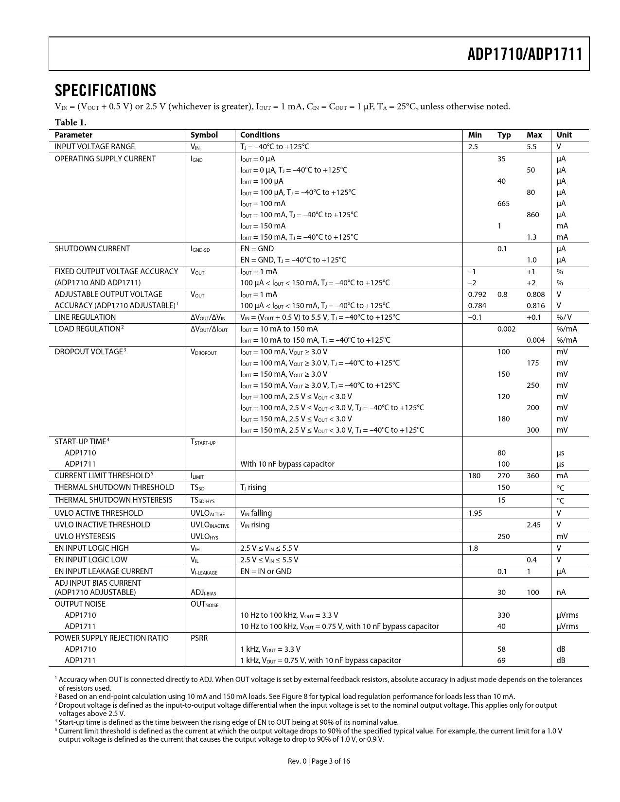 页数 / 页16 / 3 — ADP1710/ADP1711. SPECIFICATIONS. Table 1. Parameter. Symbol. Conditions. …