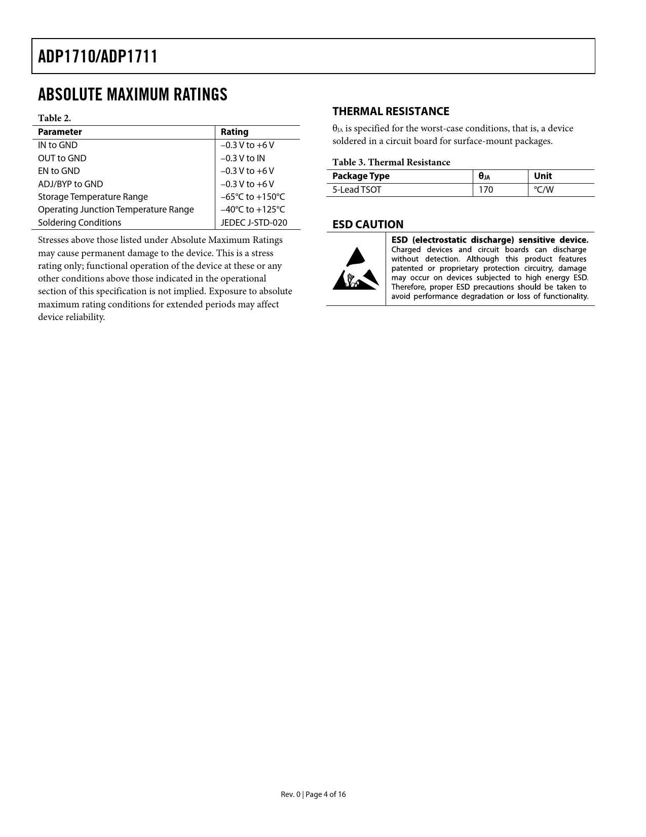 ADP1710/ADP1711 ABSOLUTE MAXIMUM RATINGS THERMAL RESISTANCE Table 2 Parameter Rating Table 3 Thermal Resistance