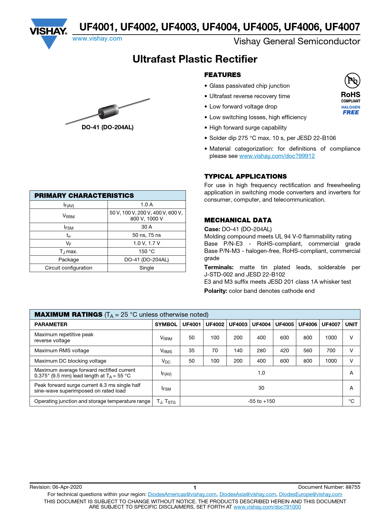 UF4001, UF4002, UF4003, UF4004, UF4005, UF4006, UF4007 www.vishay.com Vishay General Semiconductor Ultrafast Plastic Rectifier FEATURES • Glass passivated chip junction • Ultrafast reverse recovery time • Low forward voltage drop • Low switching losses, high efficiency DO-41 (DO-204AL) • High forward surge capability • Solder dip 275 °C max. 10 s, per JESD 22-B106 • Material categorization: for definitions of compliance please see www.vishay.com/doc?99912 TYPICAL APPLICATIONS For use in high frequency rectification and freewheeling application in switching mode converters and inverters for PRIMARY CHARACTERISTICS consumer, computer, and telecommunication. IF(AV) 1.0 A 50 V, 100 V, 200 V, 400 V, 600 V, VRRM 800 V, 1000 V MECHANICAL DATA IFSM 30 A Case: DO-41 (DO-204AL) trr 50 ns, 75 ns Molding compound meets UL 94 V-0 flammability rating VF 1.0 V, 1.7 V Base P/N-E3 - RoHS-compliant, commercial grade T Base P/N-M3 - halogen-free, RoHS-compliant, commercial J max. 150 °C grade Package DO-41 (DO-204AL) Circuit configuration Single Terminals: matte tin plated leads, solderable per J-STD-002 and JESD 22-B102 E3 and M3 suffix meets JESD 201 class 1A whisker test Polarity: color band denotes cathode end MAXIMUM RATINGS (TA = 25 °C unless otherwise noted) PARAMETER SYMBOL UF4001 UF4002 UF4003 UF4004 UF4005 UF4006 UF4007 UNIT Maximum repetitive peak V reverse voltage RRM 50 100 200 400 600 800 1000 V Maximum RMS voltage VRMS 35 70 140 280 420 560 700 V Maximum DC blocking voltage VDC 50 100 200 400 600 800 1000 V Maximum average forward rectified current I 0.375" (9.5 mm) lead length at T F(AV) 1.0 A A = 55 °C Peak forward surge current 8.3 ms single half I sine-wave superimposed on rated load FSM 30 A Operating junction and storage temperature range TJ, TSTG -55 to +150 °C Revision: 06-Apr-2020 1 Document Number: 88755 For technical questions within your region: DiodesAmericas@vishay.com, DiodesAsia@vishay.com, DiodesEurope@vishay.com THIS DOCUMENT IS SUBJECT TO CHANGE WITHOUT NOTICE. THE PRODUCTS DESCRIBED HEREIN AND THIS DOCUMENT ARE SUBJECT TO SPECIFIC DISCLAIMERS, SET FORTH AT www.vishay.com/doc?91000