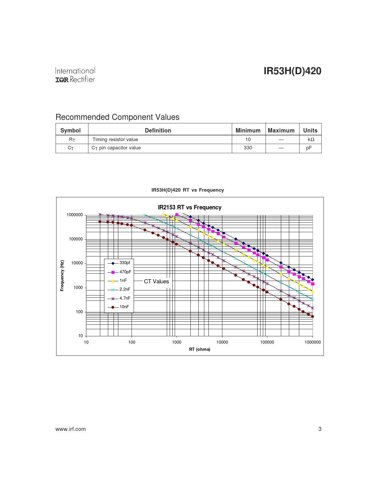 IR53H(D)420. Symbol. Definition. Minimum. Maximum. Units. IR53H(D)420 RT vs Frequency. IR2153 RT vs Frequency. Frequency (Hz). RT (ohms)