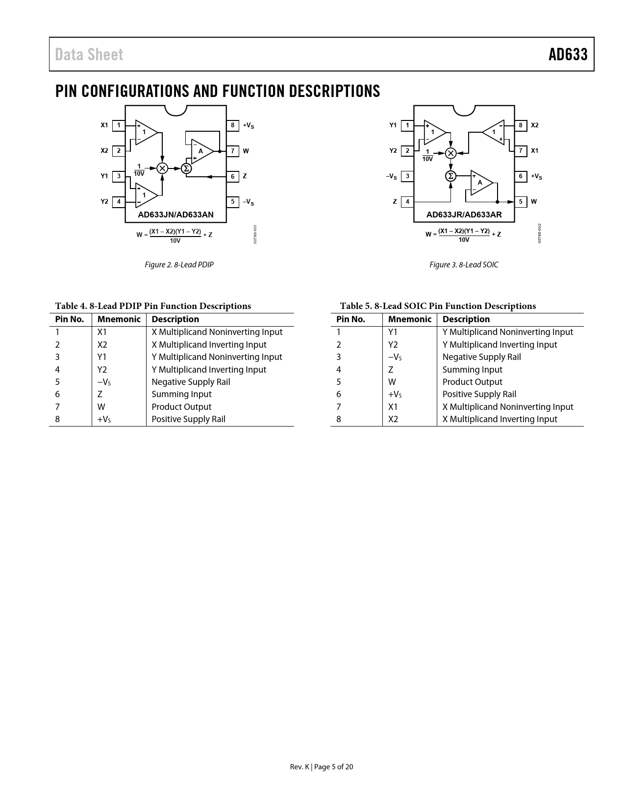 | 页数 / 页 | 20 / 5 — Data Sheet. AD633. PIN CONFIGURATIONS AND FUNCTION DESCRIPTIONS. +VS. … |