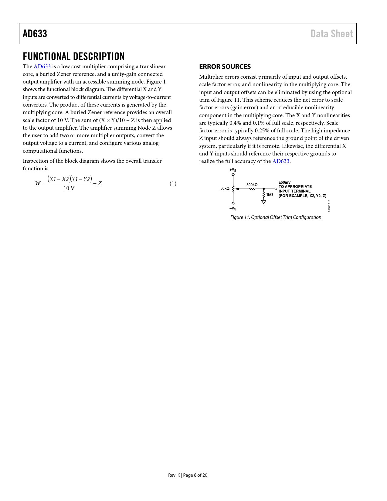 link to page 1 link to page 8 AD633Data SheetFUNCTIONAL DESCRIPTION The AD633 is a low cost multiplier comprising a translinear ERROR SOURCES core, a buried Zener reference, and a unity-gain connected Multiplier errors consist primarily of input and output offsets, output amplifier with an accessible summing node. Figure 1 scale factor error, and nonlinearity in the multiplying core. The shows the functional block diagram. The differential X and Y input and output offsets can be eliminated by using the optional inputs are converted to differential currents by voltage-to-current trim of Figure 11. This scheme reduces the net error to scale converters. The product of these currents is generated by the factor errors (gain error) and an irreducible nonlinearity multiplying core. A buried Zener reference provides an overal component in the multiplying core. The X and Y nonlinearities scale factor of 10 V. The sum of (X × Y)/10 + Z is then applied are typically 0.4% and 0.1% of full scale, respectively. Scale to the output amplifier. The amplifier summing Node Z allows factor error is typically 0.25% of full scale. The high impedance the user to add two or more multiplier outputs, convert the Z input should always reference the ground point of the driven output voltage to a current, and configure various analog system, particularly if it is remote. Likewise, the differential X computational functions. and Y inputs should reference their respective grounds to Inspection of the block diagram shows the overall transfer realize the ful accuracy of the AD633. function is +VS (X1− X2)(Y1−Y2) W = + Z (1) ±50mV 10 V 300kΩTO APPROPRIATE50kΩINPUT TERMINAL1kΩ(FOR EXAMPLE, X2, Y2, Z) 010 –VS 00786- Figure 11. Optional Offset Trim Configuration Rev. K | Page 8 of 20 Document Outline FEATURES APPLICATIONS FUNCTIONAL BLOCK DIAGRAM GENERAL DESCRIPTION PRODUCT HIGHLIGHTS TABLE OF CONTENTS REVISION HISTORY SPECIFICATIONS ABSOLUTE MAXIMUM RATINGS THERMAL RESISTANCE ESD CAUTION PIN CONFIGURATIONS AND FUNCTION DESCRIPTIONS TYPICAL PERFORMANCE CHARACTERISTICS FUNCTIONAL DESCRIPTION ERROR SOURCES APPLICATIONS INFORMATION MULTIPLIER CONNECTIONS SQUARING AND FREQUENCY DOUBLING GENERATING INVERSE FUNCTIONS VARIABLE SCALE FACTOR CURRENT OUTPUT LINEAR AMPLITUDE MODULATOR VOLTAGE-CONTROLLED, LOW-PASS AND HIGH-PASS FILTERS VOLTAGE-CONTROLLED QUADRATURE OSCILLATOR AUTOMATIC GAIN CONTROL (AGC) AMPLIFIERS MODEL RESULTS EXAMPLES OF DC, SIN, AND PULSE SOLUTIONS USING MULTISIM EXAMPLES OF DC, SIN, AND PULSE SOLUTIONS USING PSPICE EXAMPLES OF DC, SIN, AND PULSE SOLUTIONS USING SIMETRIX EVALUATION BOARD OUTLINE DIMENSIONS ORDERING GUIDE