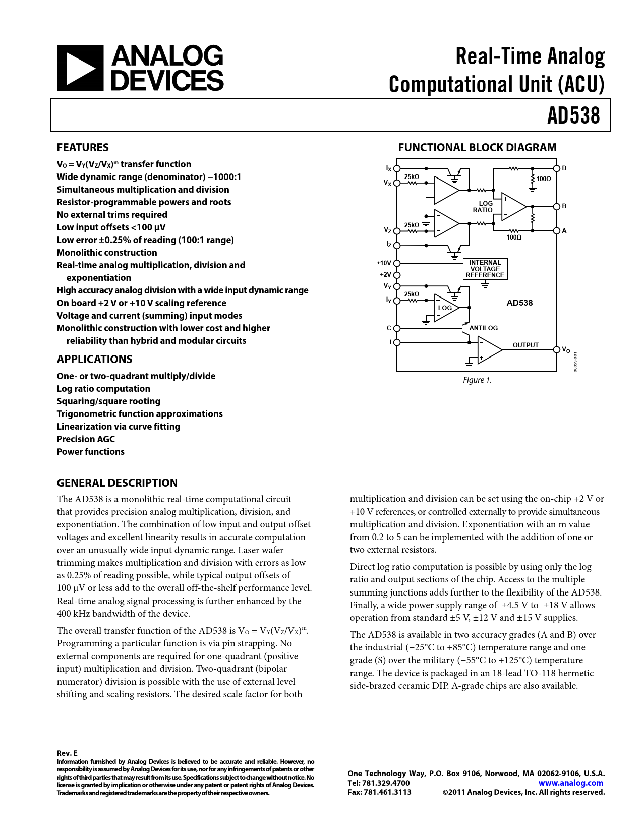 Real-Time Analog. Computational Unit (ACU). AD538. FEATURES. FUNCTIONAL BLOCK DIAGRAM. VO = VY(VZ/VX)m transfer function