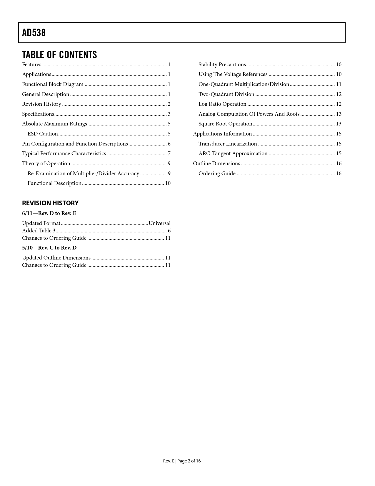 link to page 1 link to page 1 link to page 1 link to page 1 link to page 2 link to page 3 link to page 5 link to page 5 link to page 6 link to page 7 link to page 9 link to page 9 link to page 10 link to page 10 link to page 10 link to page 11 link to page 12 link to page 12 link to page 13 link to page 13 link to page 15 link to page 15 link to page 15 link to page 16 link to page 16 AD538TABLE OF CONTENTS Features .. 1 Stability Precautions ... 10 Applications ... 1 Using The Voltage References .. 10 Functional Block Diagram .. 1 One-Quadrant Multiplication/Division .. 11 General Description ... 1 Two-Quadrant Division .. 12 Revision History ... 2 Log Ratio Operation .. 12 Specifications ... 3 Analog Computation Of Powers And Roots .. 13 Absolute Maximum Ratings .. 5 Square Root Operation .. 13 ESD Caution .. 5 Applications Information .. 15 Pin Configuration and Function Descriptions ... 6 Transducer Linearization .. 15 Typical Performance Characteristics ... 7 ARC-Tangent Approximation .. 15 Theory of Operation .. 9 Outline Dimensions ... 16 Re-Examination of Multiplier/Divider Accuracy .. 9 Ordering Guide .. 16 Functional Description .. 10 REVISION HISTORY 6/11—Rev. D to Rev. E Updated Format .. Universal Added Table 3 .. 6 Changes to Ordering Guide .. 11 5/10—Rev. C to Rev. D Updated Outline Dimensions ... 11 Changes to Ordering Guide .. 11 Rev. E | Page 2 of 16 Document Outline Features Applications Functional Block Diagram General Description Revision History Specifications Absolute Maximum Ratings ESD Caution Pin Configuration and Function Descriptions Typical Performance Characteristics Theory of Operation Re-Examination of Multiplier/Divider Accuracy Functional Description Stability Precautions Using The Voltage References One-Quadrant Multiplication/Division Two-Quadrant Division Log Ratio Operation Analog Computation Of Powers And Roots Square Root Operation Applications Information Transducer Linearization ARC-Tangent Approximation Outline Dimensions Ordering Guide