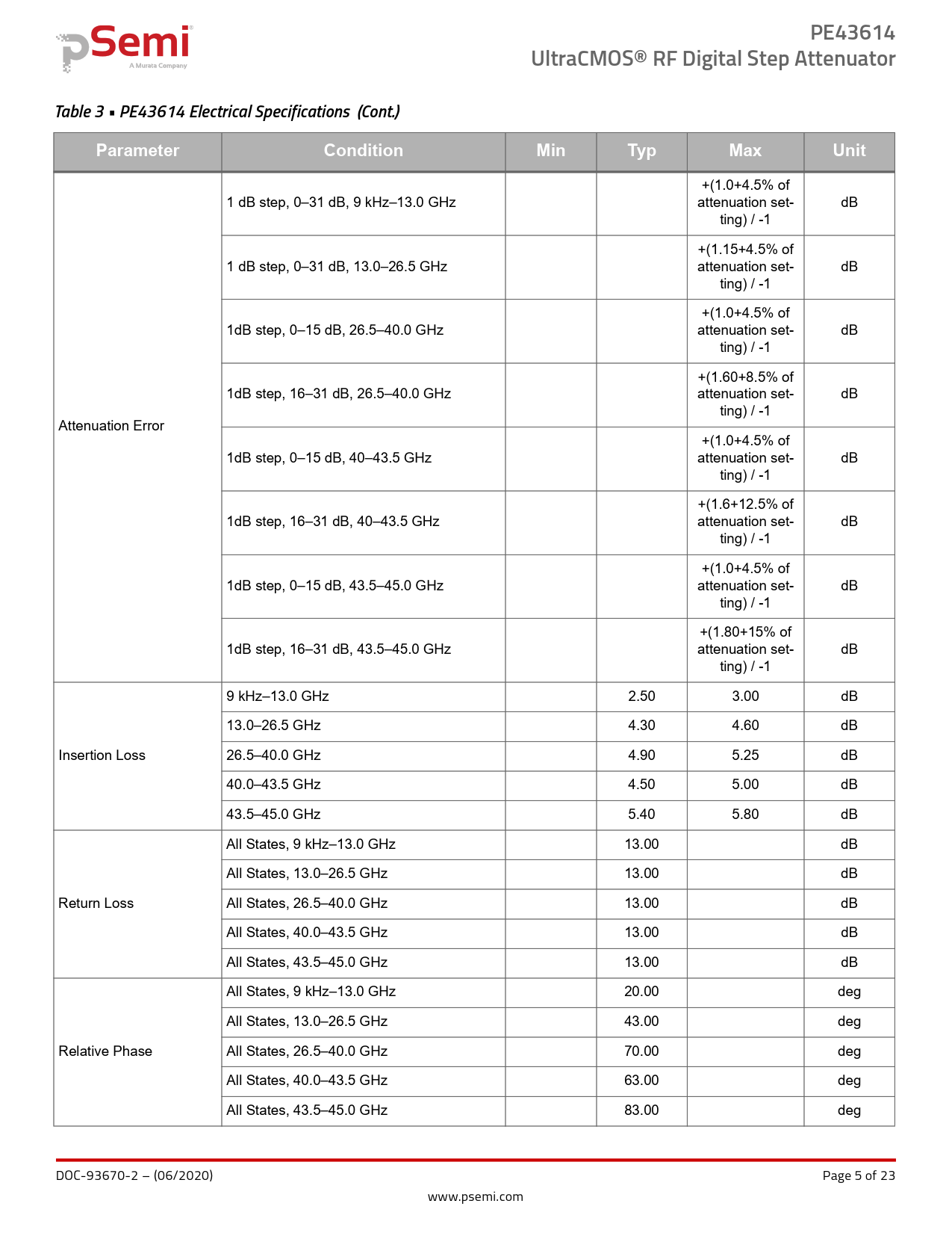 +(1.0+4.5% of 1 dB step, 0–31 dB, 9 kHz–13.0 GHz attenuation set- dB ting) / -1 +(1.15+4.5% of 1 dB step, 0–31 dB, 13.0–26.5 GHz attenuation set- dB ting) / -1 +(1.0+4.5% of 1dB step, 0–15 dB, 26.5–40.0 GHz attenuation set- dB ting) / -1 +(1.60+8.5% of 1dB step, 16–31 dB, 26.5–40.0 GHz attenuation set- dB ting) / -1 Attenuation Error +(1.0+4.5% of 1dB step, 0–15 dB, 40–43.5 GHz attenuation set- dB ting) / -1 +(1.6+12.5% of 1dB step, 16–31 dB, 40–43.5 GHz attenuation set- dB ting) / -1 +(1.0+4.5% of 1dB step, 0–15 dB, 43.5–45.0 GHz attenuation set- dB ting) / -1 +(1.80+15% of 1dB step, 16–31 dB, 43.5–45.0 GHz attenuation set- dB ting) / -1 9 kHz–13.0 GHz 2.50 3.00 dB 13.0–26.5 GHz 4.30 4.60 dB Insertion Loss 26.5–40.0 GHz 4.90 5.25 dB 40.0–43.5 GHz 4.50 5.00 dB 43.5–45.0 GHz 5.40 5.80 dB All States, 9 kHz–13.0 GHz 13.00 dB All States, 13.0–26.5 GHz 13.00 dB Return Loss All States, 26.5–40.0 GHz 13.00 dB All States, 40.0–43.5 GHz 13.00 dB All States, 43.5–45.0 GHz 13.00 dB All States, 9 kHz–13.0 GHz 20.00 deg All States, 13.0–26.5 GHz 43.00 deg Relative Phase All States, 26.5–40.0 GHz 70.00 deg All States, 40.0–43.5 GHz 63.00 deg All States, 43.5–45.0 GHz 83.00 deg DOC-93670-2 – (06/2020) Page 5 of 23 www.psemi.com Document Outline Features Applications Product Description Optional External VSS Control Absolute Maximum Ratings ESD Precautions Latch-up Immunity Recommended Operating Conditions Electrical Specifications Switching Frequency Spur-free Performance Glitch-safe Attenuation State The PE43614 features a novel architecture to provide safe transition behavior when changing attenuation states. When RF input power is applied, positive output power spikes are prevented during attenuation state changes by optimized internal timing c... Truth Tables Serial Addressable Register Map Programming Options Parallel/Serial Selection Parallel Mode Interface For direct parallel programming, the LE line should be pulled HIGH. Changing attenuation state control values changes the device state to new attenuation. Direct mode is ideal for manual control of the device (using hardwire, switches, or jumpers). Serial-Addressable Interface Power-up Control Settings Typical Performance Data Pin Configuration Packaging Information Moisture Sensitivity Level Package Drawing Top-Marking Specification Tape and Reel Specification Ordering Information