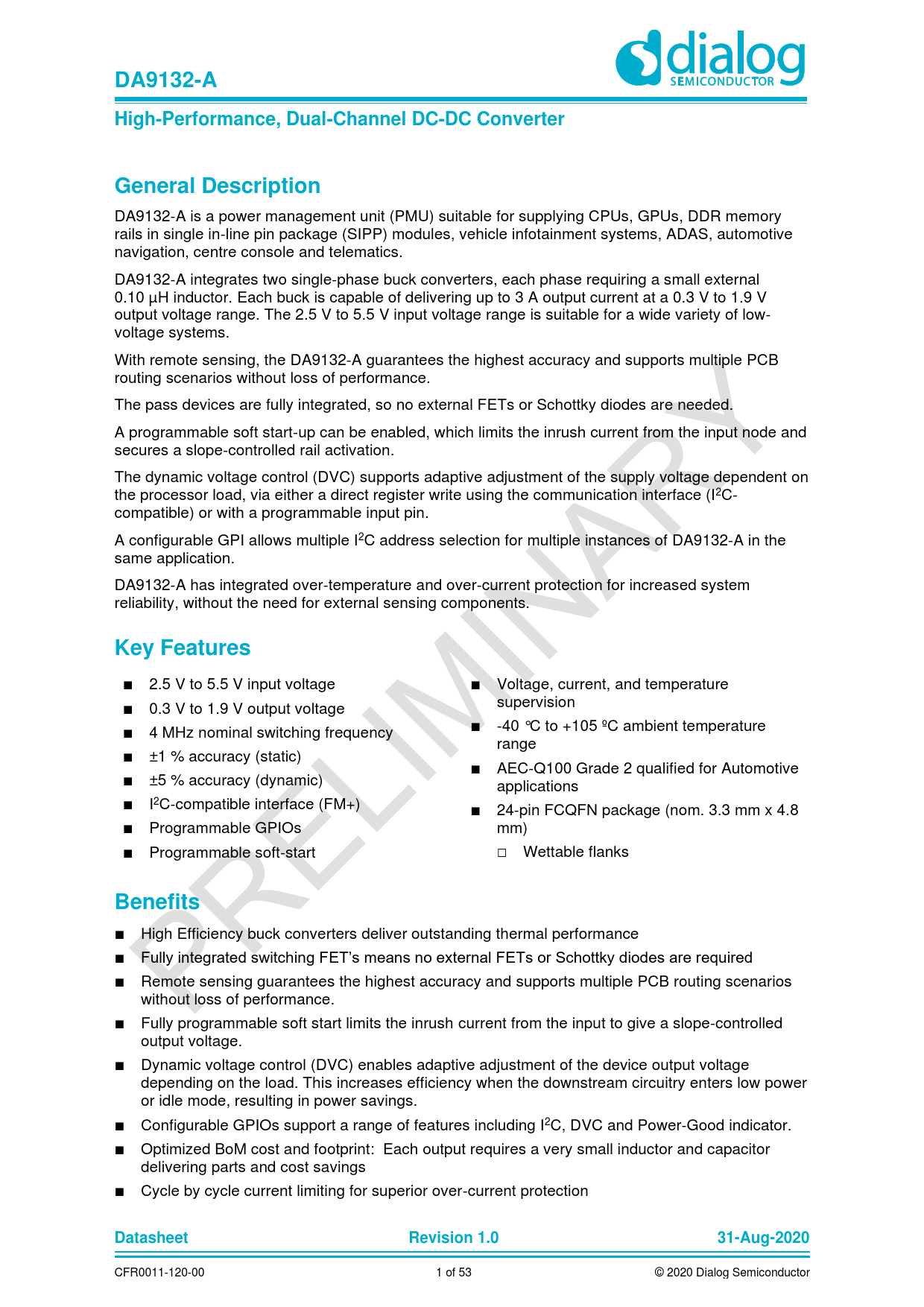 DA9132-A. High-Performance, Dual-Channel DC-DC Converter. General Description. Key Features. Benefits. Datasheet. Revision 1.0