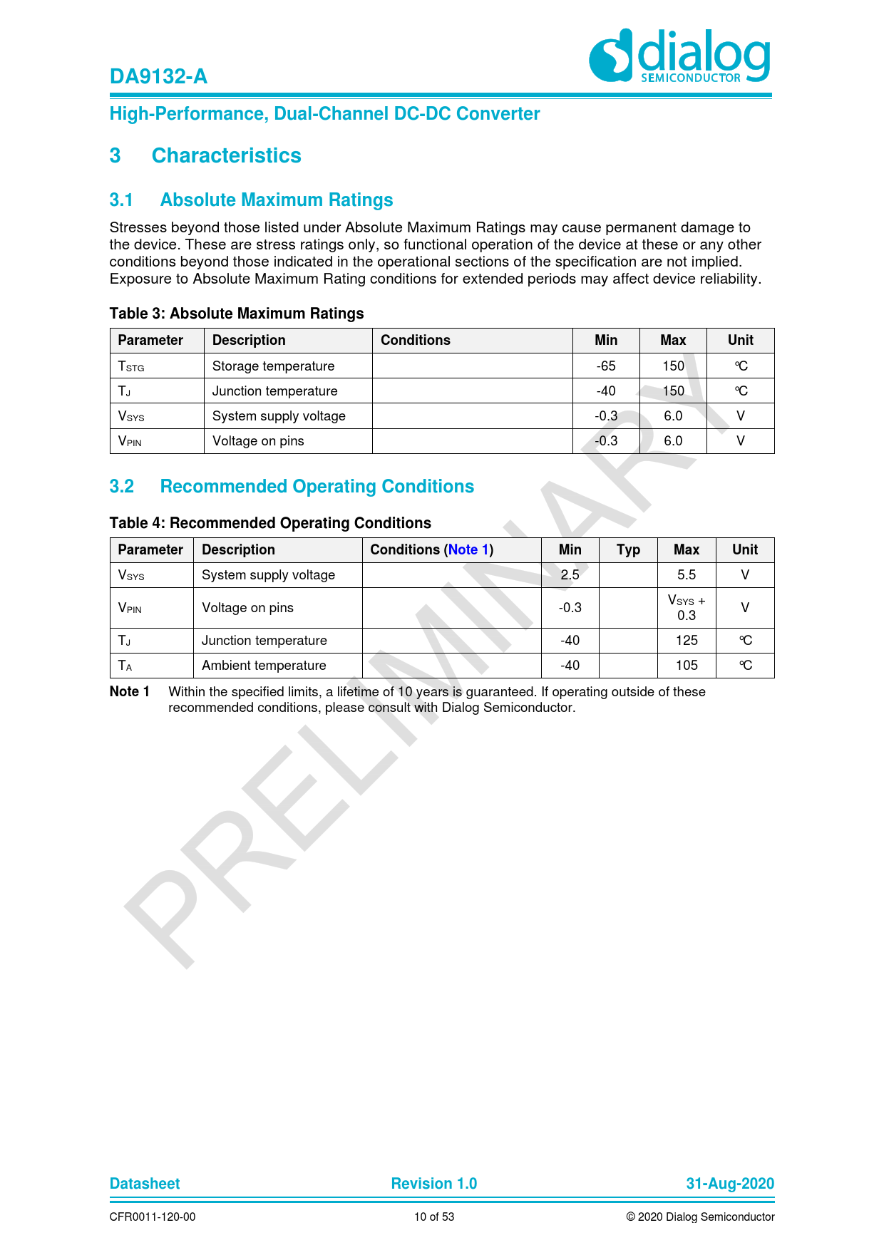 Within the specified limits, a lifetime of 10 years is guaranteed. If operating outside of these recommended conditions, please consult with Dialog Semiconductor.