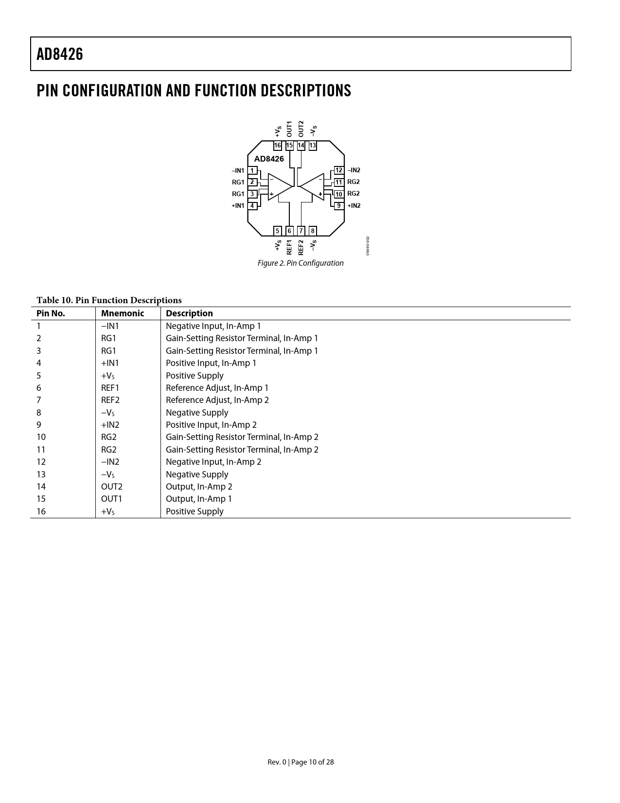 AD8426. PIN CONFIGURATION AND FUNCTION DESCRIPTIONS. 16 15 14 13. –IN1 1. 12 –IN2. RG1 2. 11 RG2. RG1 3. 10 RG2. +IN1 4. +IN2