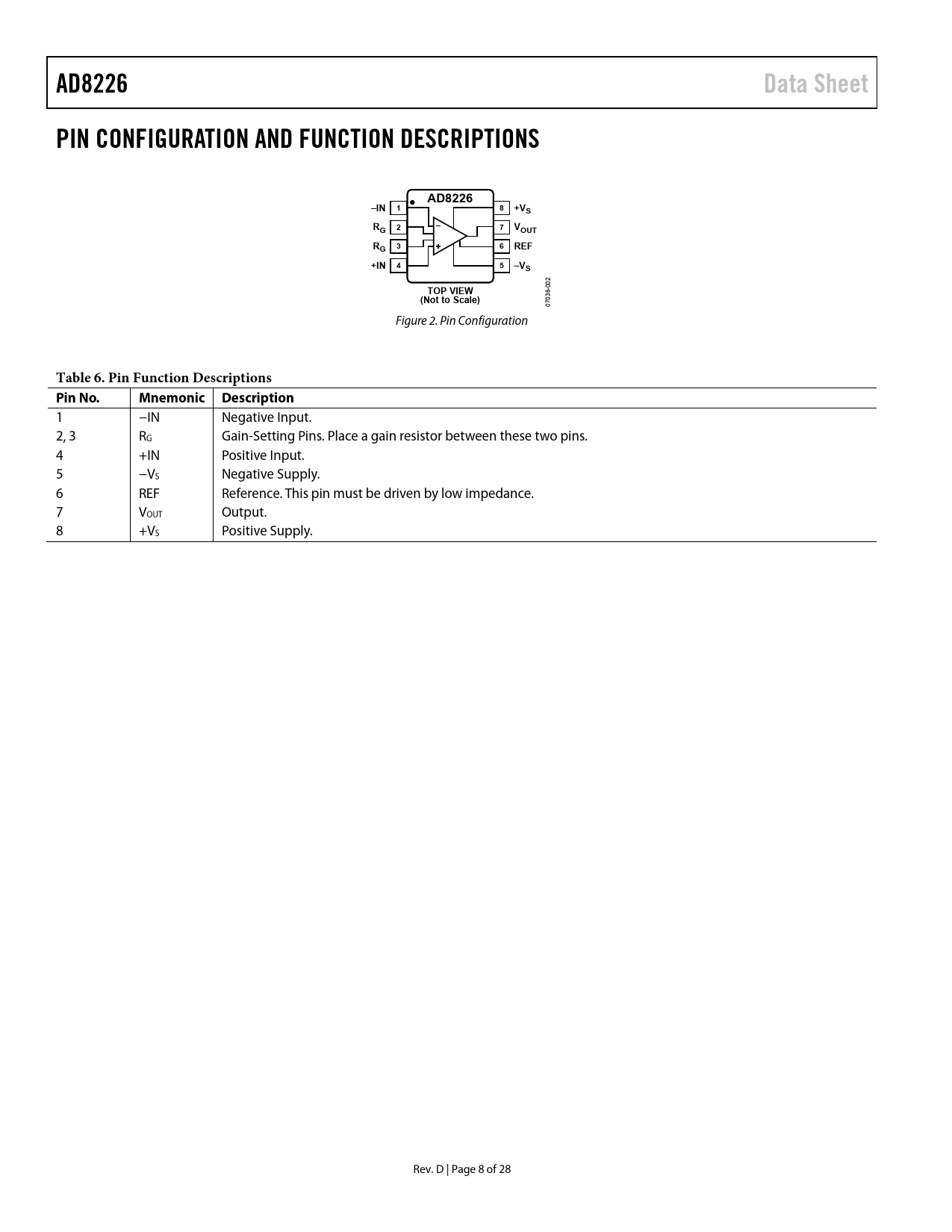 AD8226. Data Sheet. PIN CONFIGURATION AND FUNCTION DESCRIPTIONS. –IN 1. 8 +VS. RG 2. 7 VOUT. RG 3. 6 REF. +IN 4. 5 –VS. TOP VIEW